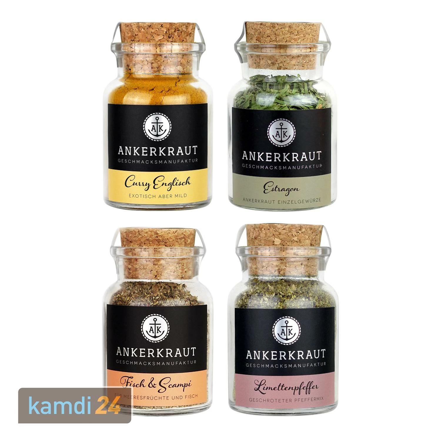 Das -Set versammelt vier hochwertige Ankerkraut-Gewürze, die sich perfekt zum Zubereiten von allerlei Fischgerichten eignen. Damit ist dieses Set empfehlenswert für jeden, der gerne Fisch grillt, bäckt oder brät – und da für eine ausgewogene Ernährung mindestens einmal pro Woche Fisch auf dem Speiseplan stehen sollte, können Sie mit dem Set quasi nichts falsch machen.