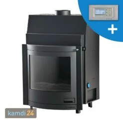 Die Steuerelektronik der Basic-Ausführung dient der direkten Ansteuerung der Klappe, deren Position die Luftzuleitung zum Brennraum des Kamineinsatzes regelt. Ein Anschluss an die Stromversorgung ist dabei nicht nötig: Die Steuerung arbeitet mit handelsüblichen Batterien. Die Basic-Steuerung dient neben dem serienmäßig verbauten Sicherheitswärmetauscher als zusätzliche Sicherheitseinrichtung: Ein Sensor misst permanent die Temperatur in der Wassertasche und veranlasst bei Überhitzung (Temperaturen über 85 °C) eine Drosselung der Zuluft, bis die Kesseltemperatur wieder unter 75 °C gesunken ist. Um mit Basic-Steuerung zu kaufen, wählen Sie die entsprechende Variante im Varianten-Menü aus.