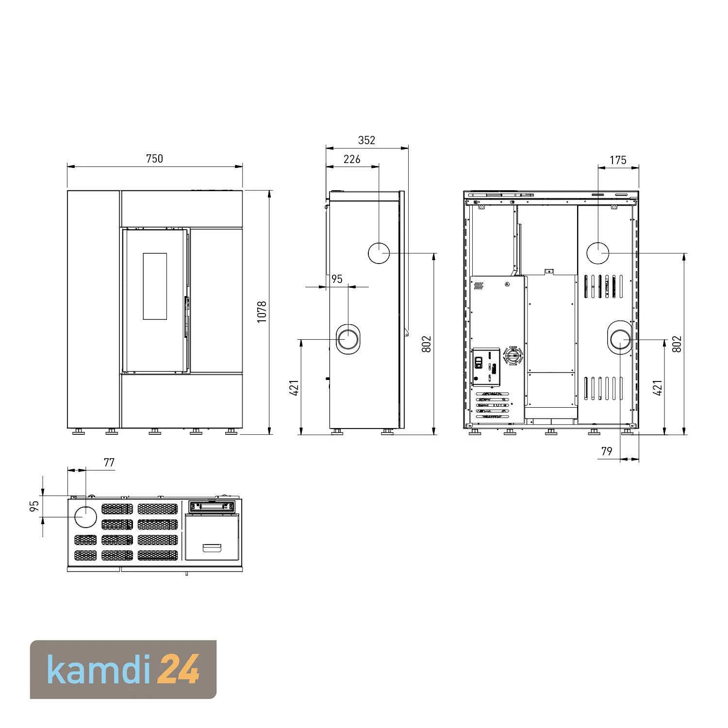 Mit dem Leyla Elite sind dank drei unterschiedlichen Rauchrohranschlussmöglichkeiten besonders flexibel in der Aufstellung des Pelletofens. Das Rauchrohr kann oben, hinten oder seitlich links befestigt werden.