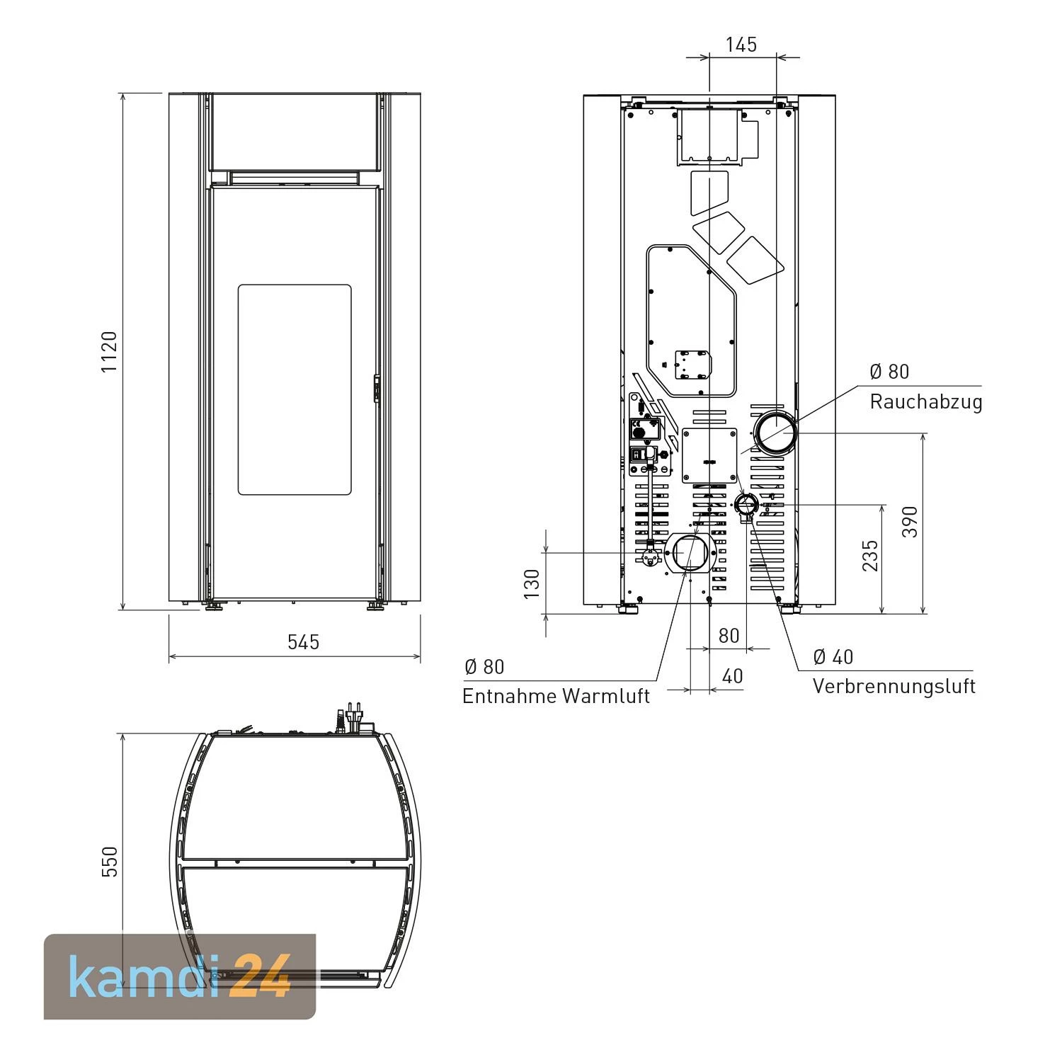 Wir bieten Ihnen diesen Ofen auch mit oberem Rauchrohranschluss als sowie ohne Warmluftkanalisierung als Pelletofen !