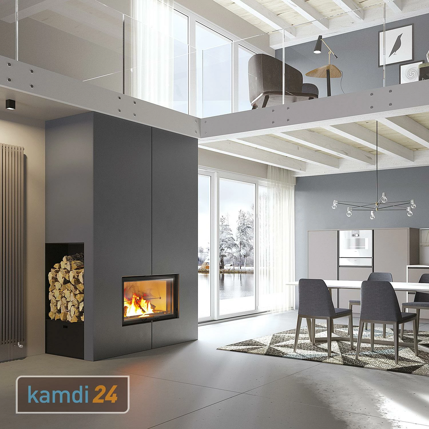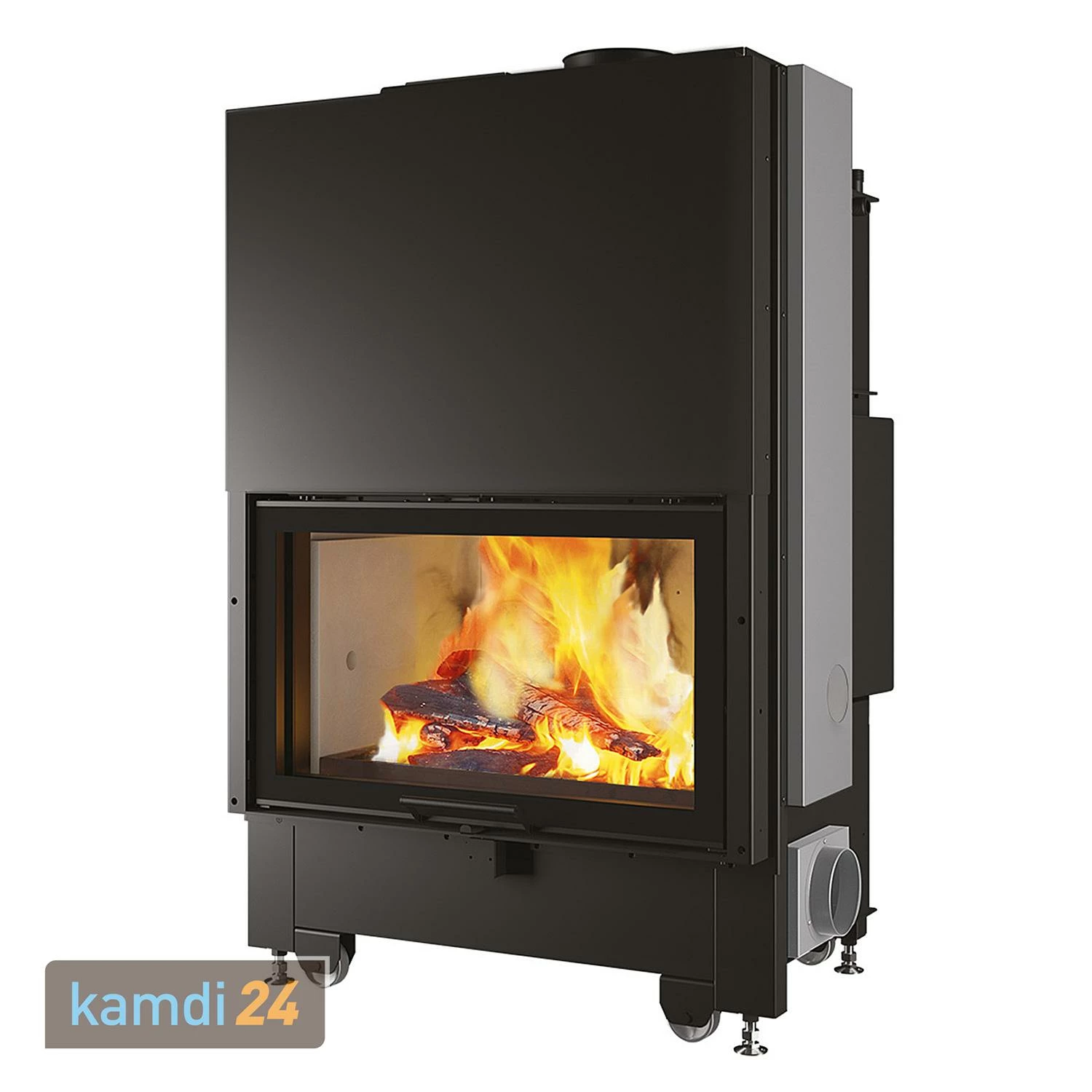 Der Feuerraum ist mit weißer Schamotte ausgekleidet. Das große Sichtfenster bietet Ihnen einen wunderbaren Blick auf das Flammenspiel. Die Tür aus Glaskeramik lässt sich nach oben schieben und zur Reinigung nach vorn öffnen. Den Griff an der Kamintür können Sie fest einbauen oder abnehmbar installieren. Zum schnellen und einfachen Anzünden des Holzkamins besitzt er ein Rauchgas-Bypassventil mit Starterfunktion, das sich von Hand betätigen lässt. Das Nachbrennsystem optimiert die Verbrennung. Die speziell entworfene Wärmetechnik holt beim Verbrennen das Optimum an Leistung zur Warmwassererwärmung heraus. Zudem gewährleistet die automatische Umlenkung der Rauchgase eine effiziente Erwärmung des Wärmetauschers. Die fasst ein Volumen von . Die hydrauliche Installation des Kamineinsatzes kann auch auf geschlossene Ausdehnungsgefäßsysteme erfolgen.