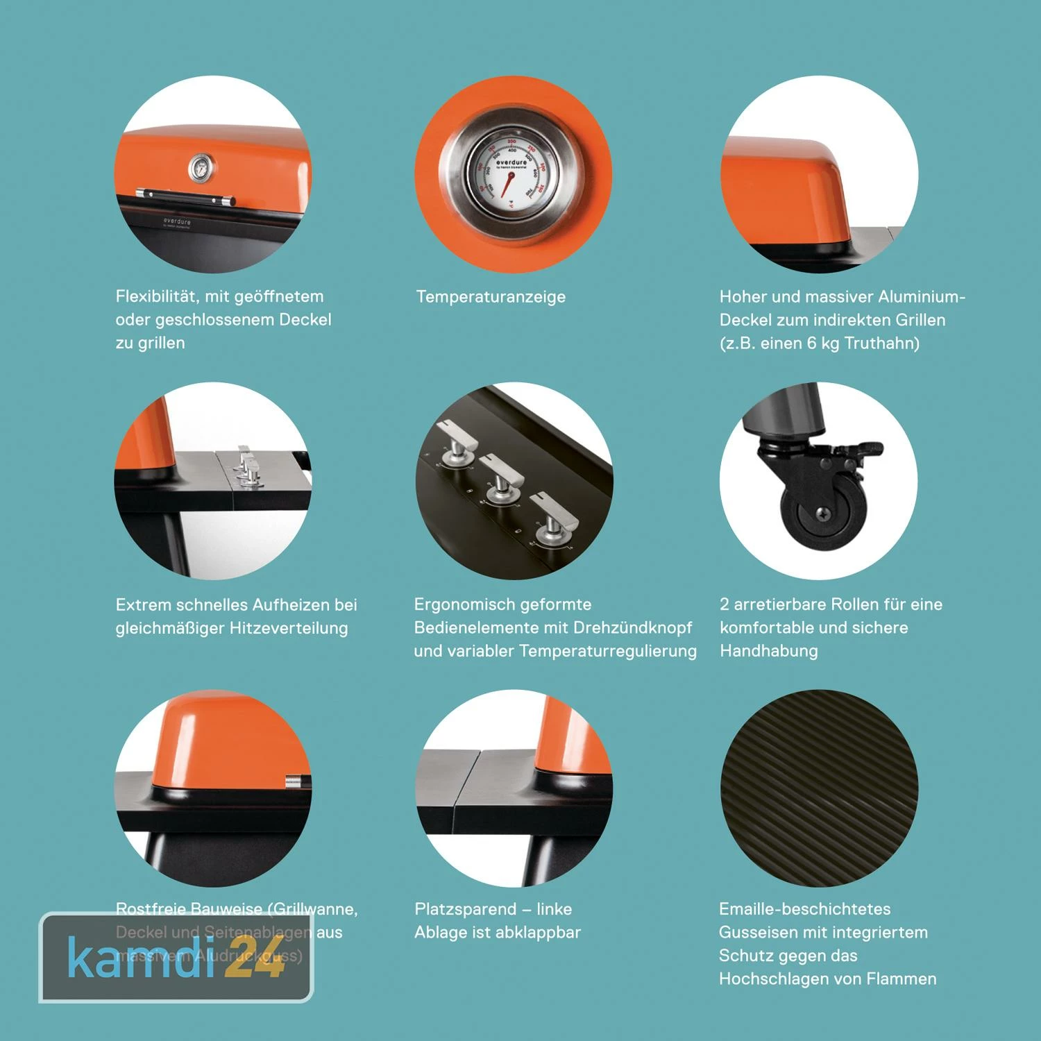 Da der Korpus von aus druckgegossenem Aluminium besteht, ergibt sich ein nahtloses Design, das die Reinigung des Grills erleichtert: keine feinen Ritzen oder Ecken, in denen sich Ruß und Fett ablagern können; zudem ist der Deckel emailliert. Daher genügt es, wenn Sie den Gasgrill nach der Nutzung einmal schwungvoll auswischen.