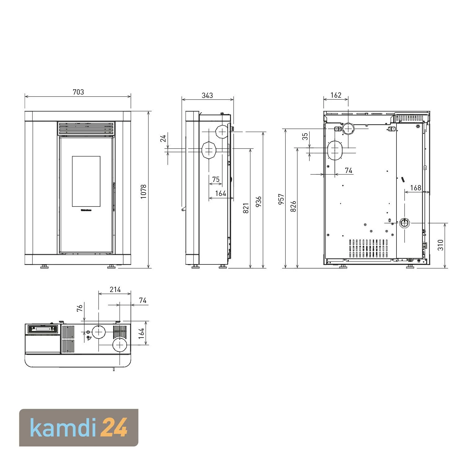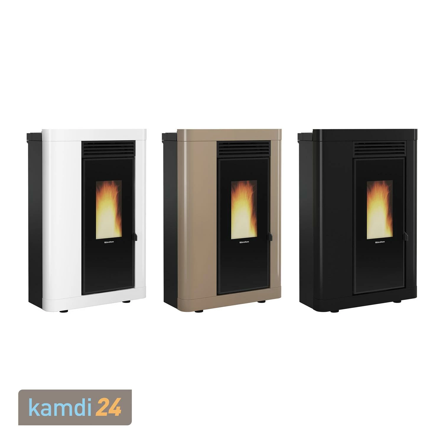ist aus hochwertig lackiertem Stahl gefertigt und in den Farben Weiß, Schwarz oder Tortora erhältlich – Ihren Favoriten bestimmen Sie über das Varianten-Menü. Außerdem können Sie das Rauchrohr oben, hinten oder seitlich rechts am Ofen anschließen für eine individuelle Aufstellung in Ihrem Wohnraum.