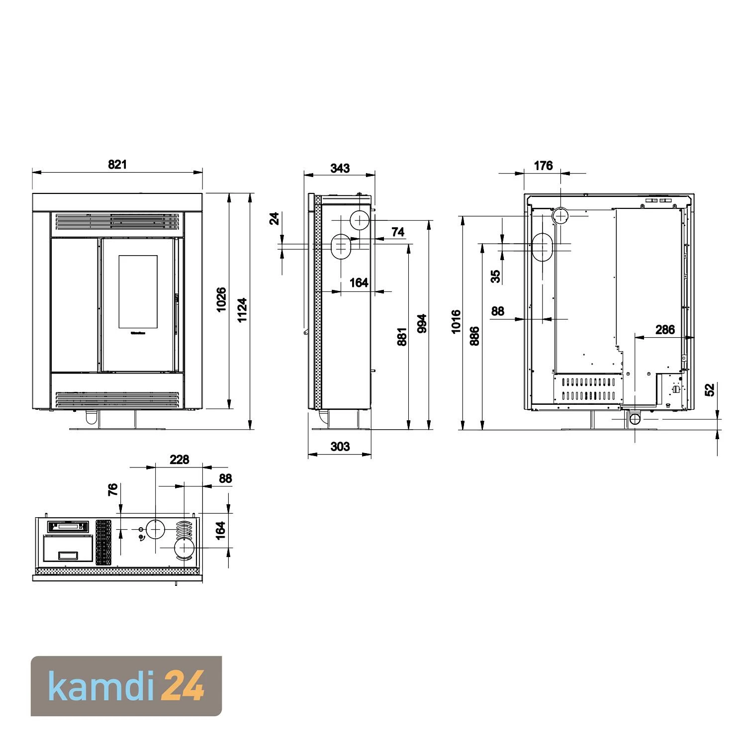 Der Pelletofen leitet die erzeugte Warmluft über eine bis zu 6 m lange Kanalisierung in angrenzende Räume. Die Anschlüsse dafür befinden sich hinten, oben und seitlich am Ofen. Das Anschlussrohr muss einen Innendurchmesser von 80 mm haben und sollte wärmegedämmt oder zumindest gegen Wärmeverluste geschützt sein. Wenn Sie ein passendes Anschlussrohr für die Kanalisierung benötigen, kontaktieren Sie uns gern, dann können wir Ihnen das richtige Produkt anbieten.