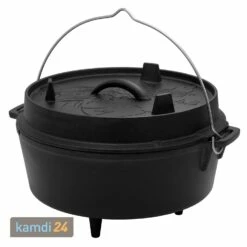 Der Gusstopf besitzt die ideale Größe und ist mit einem praktischen ausgestattet. Dadurch können Sie den Topf an einem Dreibein übers offene Feuer hängen. Oder Sie grillen mit Oberhitze und platzieren dazu mühelos Briketts auf dem Deckel. Zusätzlich ermöglichen die drei Beine des Deckels, diesen als Servierplatte oder sogar als eigenständige Pfanne zu nutzen. Der hat einen planen Boden ohne Füße, sodass dieser auch auf dem heimischen Herd zum Einsatz kommen kann.