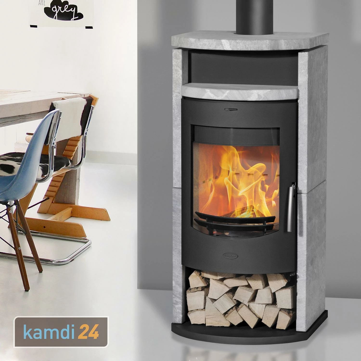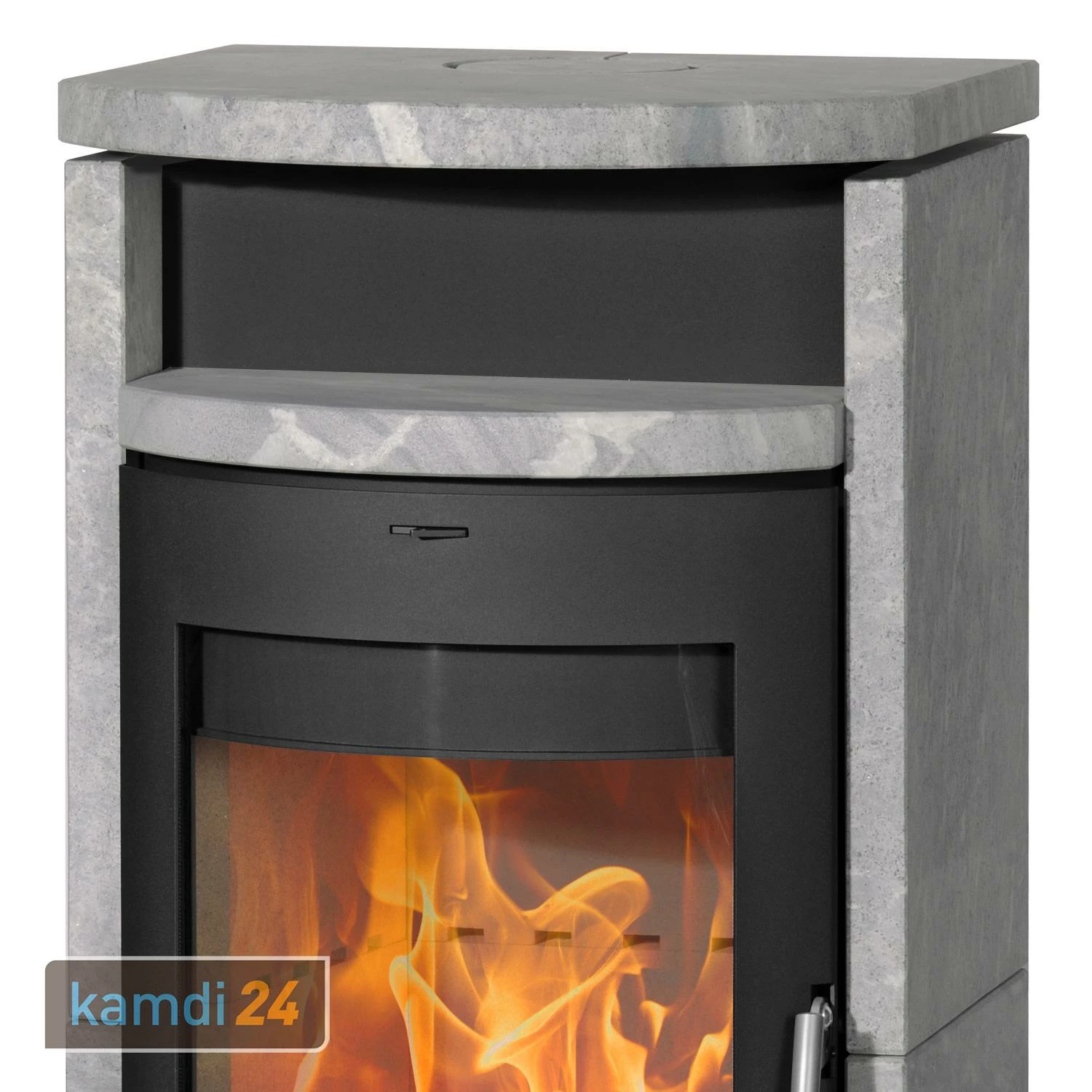 Der massive Stahl-Korpus von ist in Schwarz gehalten und wird von dicken Specksteinplatten umgeben. Jede Platte des hochwertigen Natursteins zeichnet sich durch eine individuelle Maserung aus. Diese Verkleidung sieht nicht nur toll aus, sondern dient auch als kurzzeitiger Wärmespeicher.