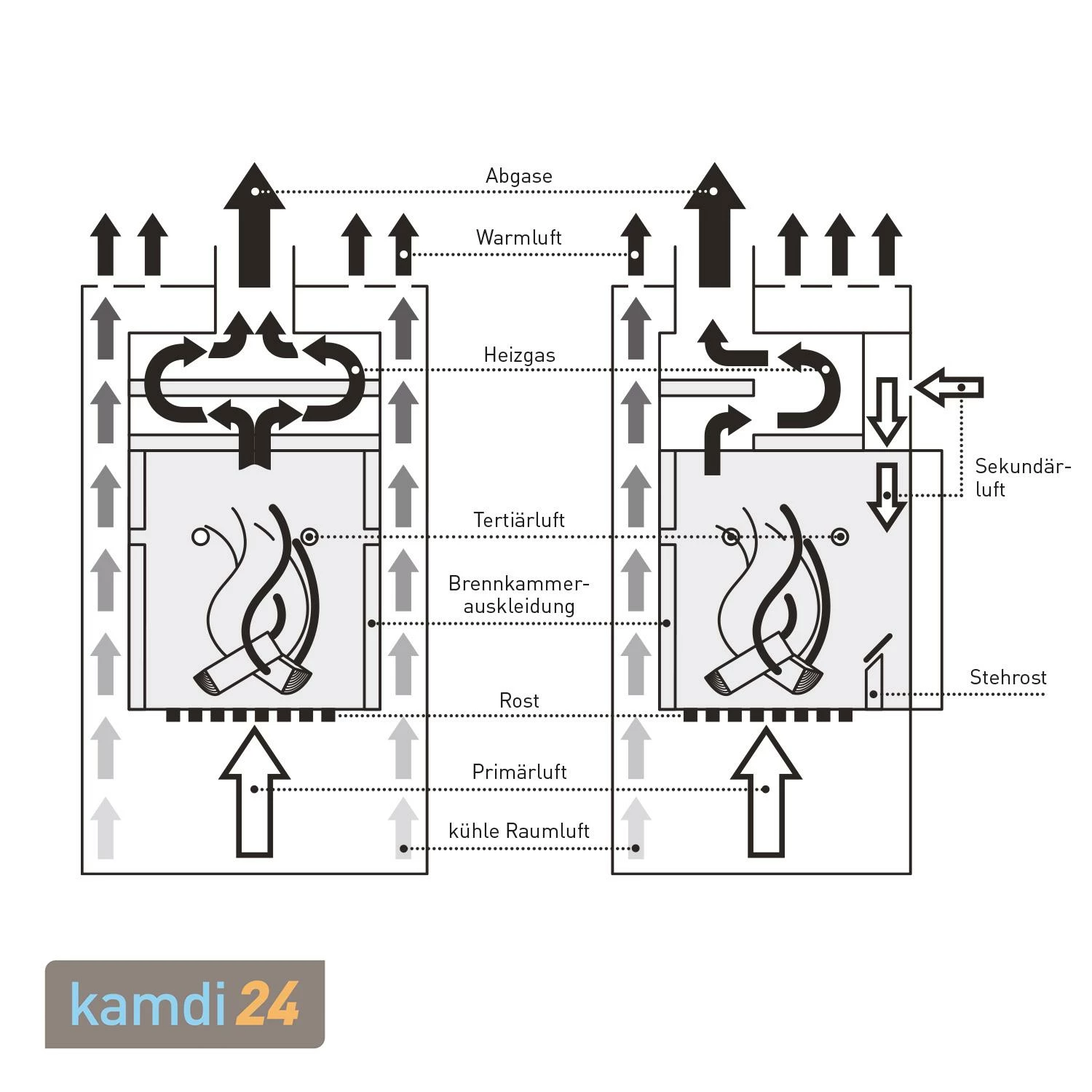 Damit Sie immer einen ungetrübten Blick auf die Flammen genießen können, wird die Scheibe der Brennkammer beim Abbrand stets durch einen vorgeheizten Luftstrom vor Schmutzablagerungen geschützt.
