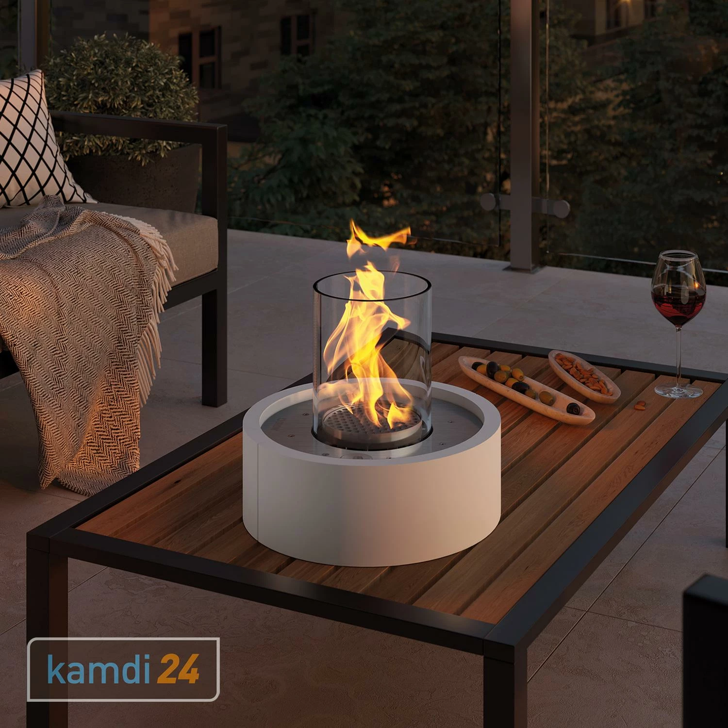 Den runden Tischkamin im zeitlosen Design gibt es in den drei Farbvarianten Schwarz, Weiß und Anthrazit, die Sie über das Varianten-Menü finden. So können Sie den Brenner genau auf die Gestaltung seiner Einsatzumgebung abstimmen.