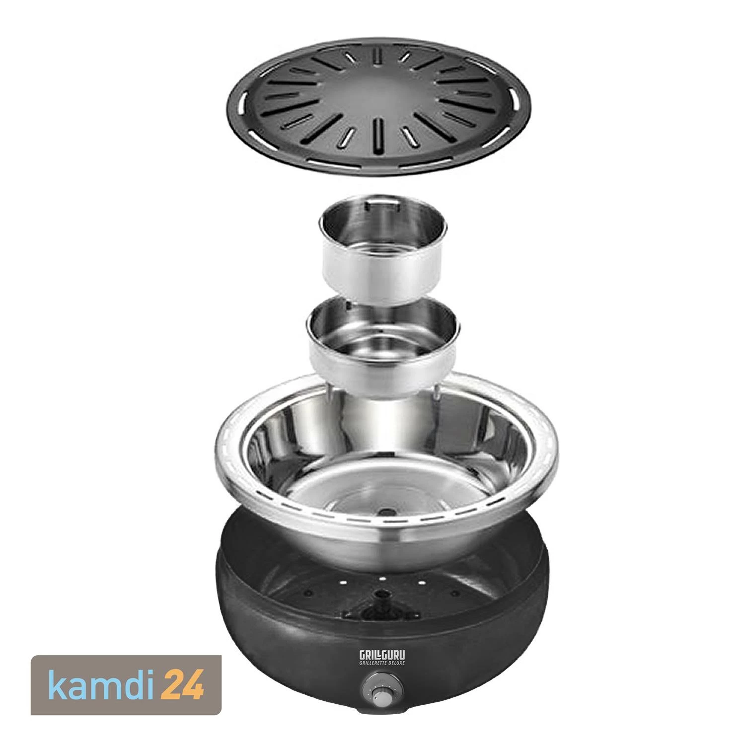 Der besteht aus einer , einem , einer sowie einer und einer . Das Fett des Grillguts tropft in die herausnehmbare Auffangschale, sodass die Entstehung von gesundheitsgefährdenden Dämpfen – beim Herabtropfen von Fett auf die Grillkohle – vermieden wird. Die Auffangschale sowie die Grillplatte können Sie einfach in der Spülmaschine reinigen.