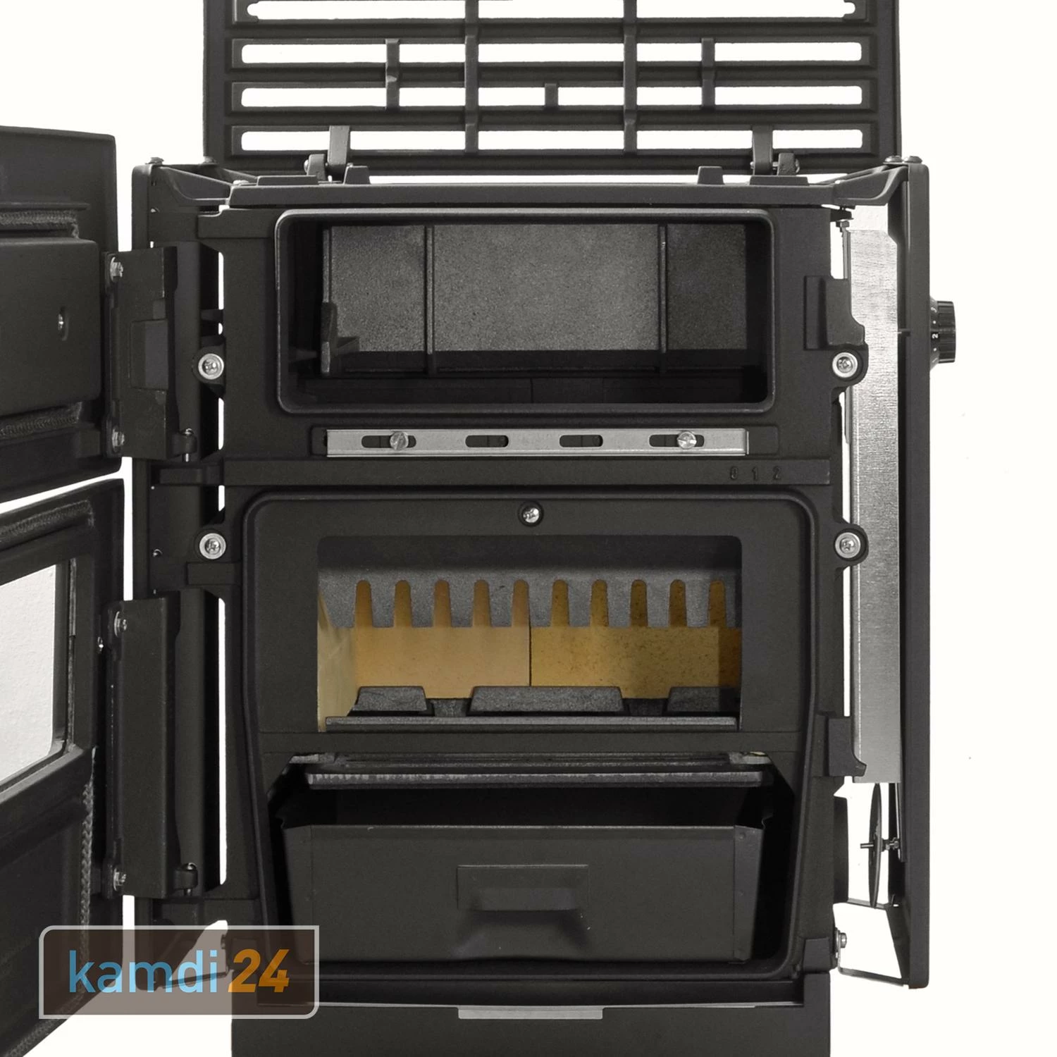 Der Kaminofen von leistet als Dauerbrandofen die Vebrennung von bis zu 33 cm Länge. Die Regulierung der Ofentemperatur erfolgt über den an der Seite oben. Dieser sorgt für einen kontrollierten Abbrand und gleichmäßige Wärme.