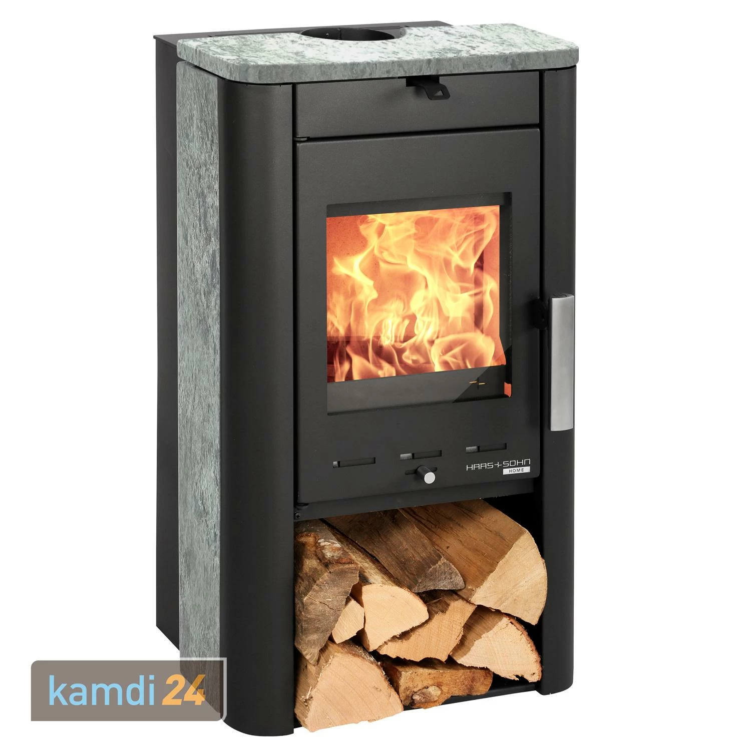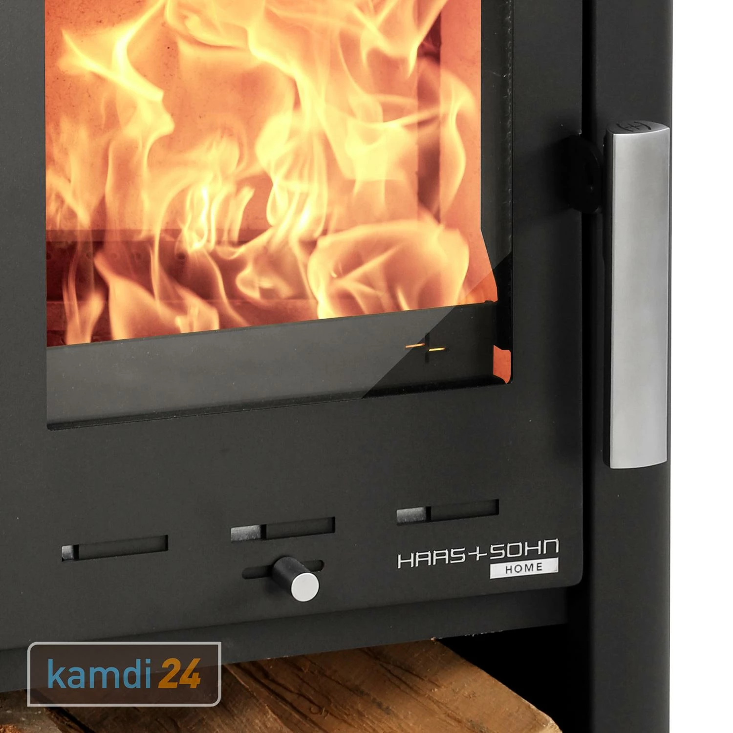 Unter dem Brennraum von befindet sich ein offenes Holzfach. Hier können Sie den Brennholz-Nachschub griffbereit lagern.