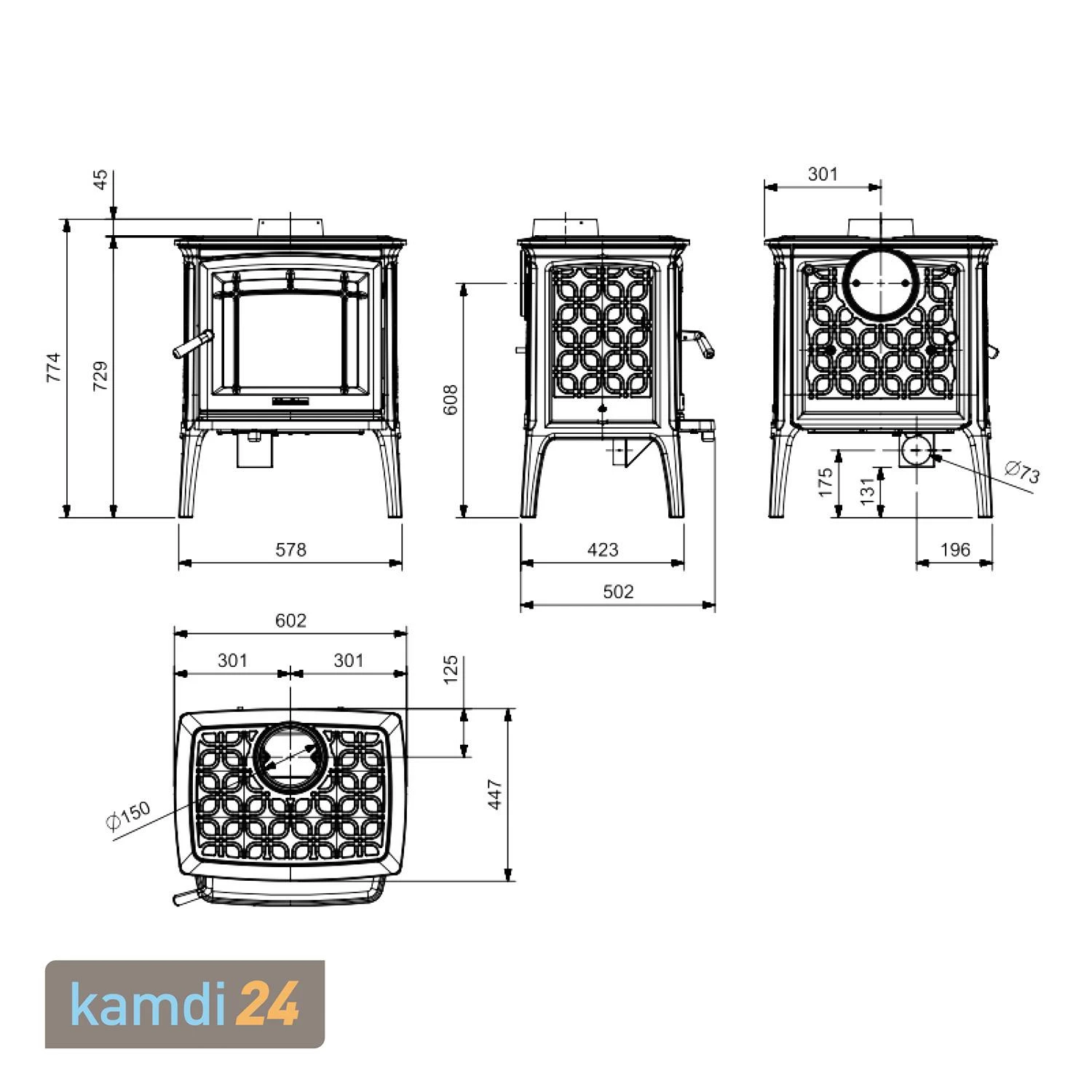 Verkleidung und Feuerraum bestehen aus Gusseisen, einem pflegeleichten und langlebigen Material. Zudem ist Gusseisen ein guter Wärmeleiter und zeichnet sich durch eine hohe Formfestigkeit sowie Temperaturbeständigkeit aus.