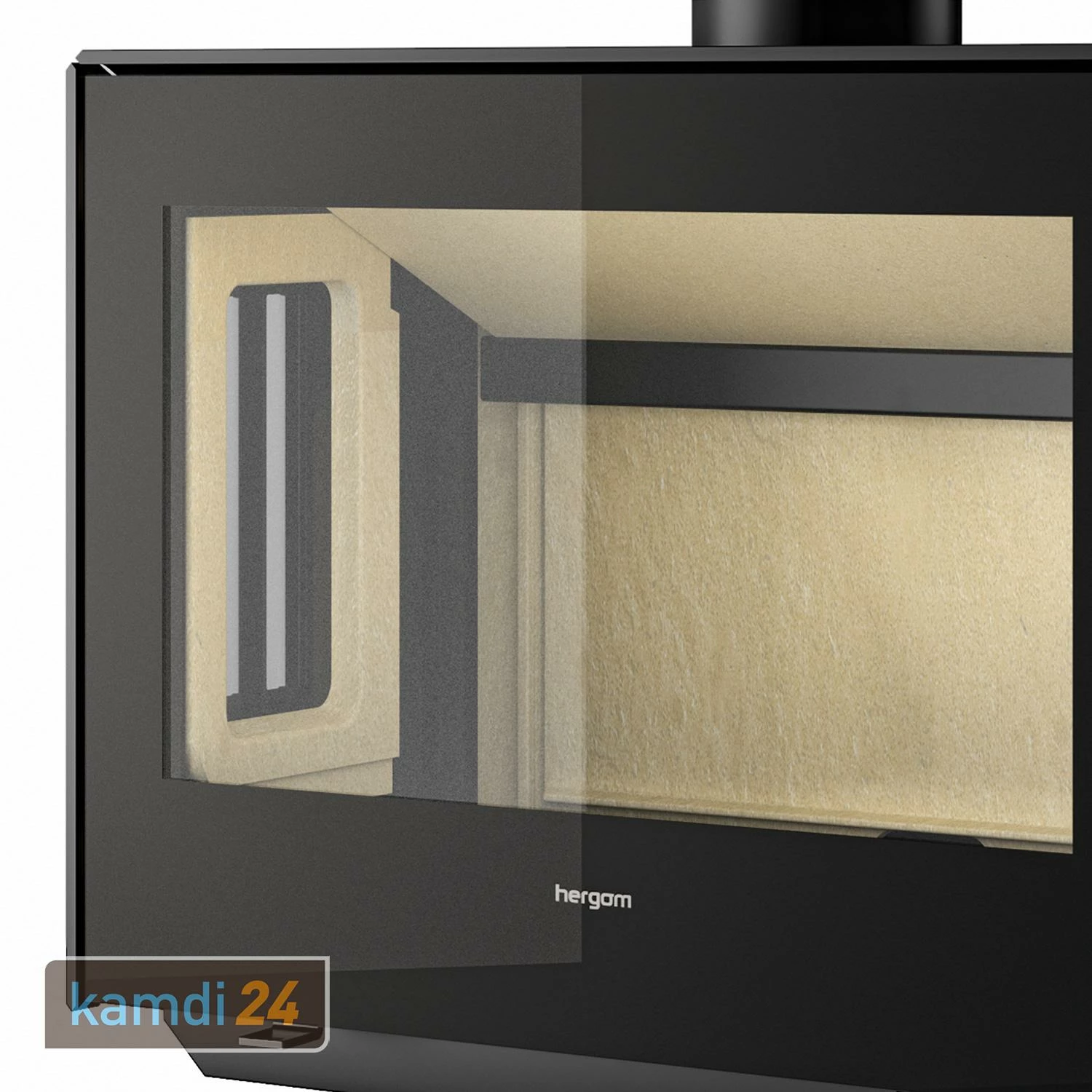 Der Feuerraum ist mit Vermiculite-Platten ausgekleidet. Das feuerfeste Material ist ein guter Wärmespeicher und sorgt für konstant hohe Temperaturen im Brennraum, auch wenn zum Nachlegen von Feuerholz die Brennraumtür geöffnet wird oder wenn der Abbrand allmählich zum Ende kommt, die Nachverbrennung aber dennoch effektiv ablaufen soll.