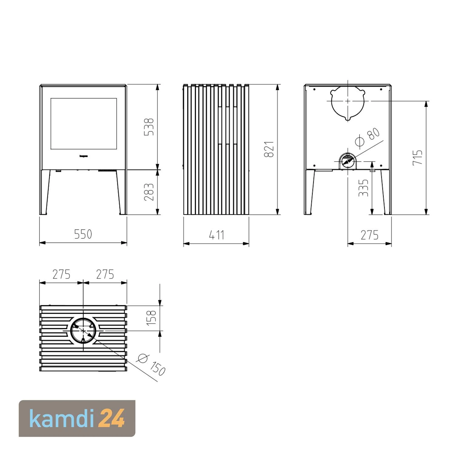 ✓ Anschluss für das Rauchrohr oben und hinten möglich