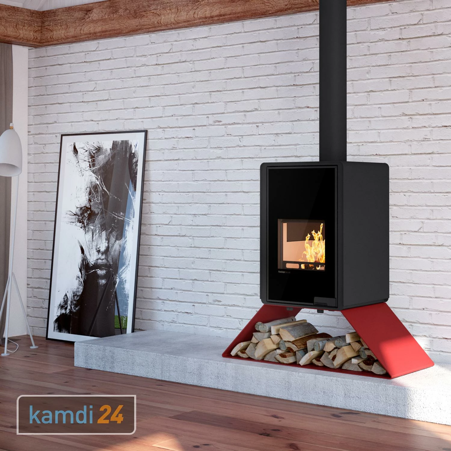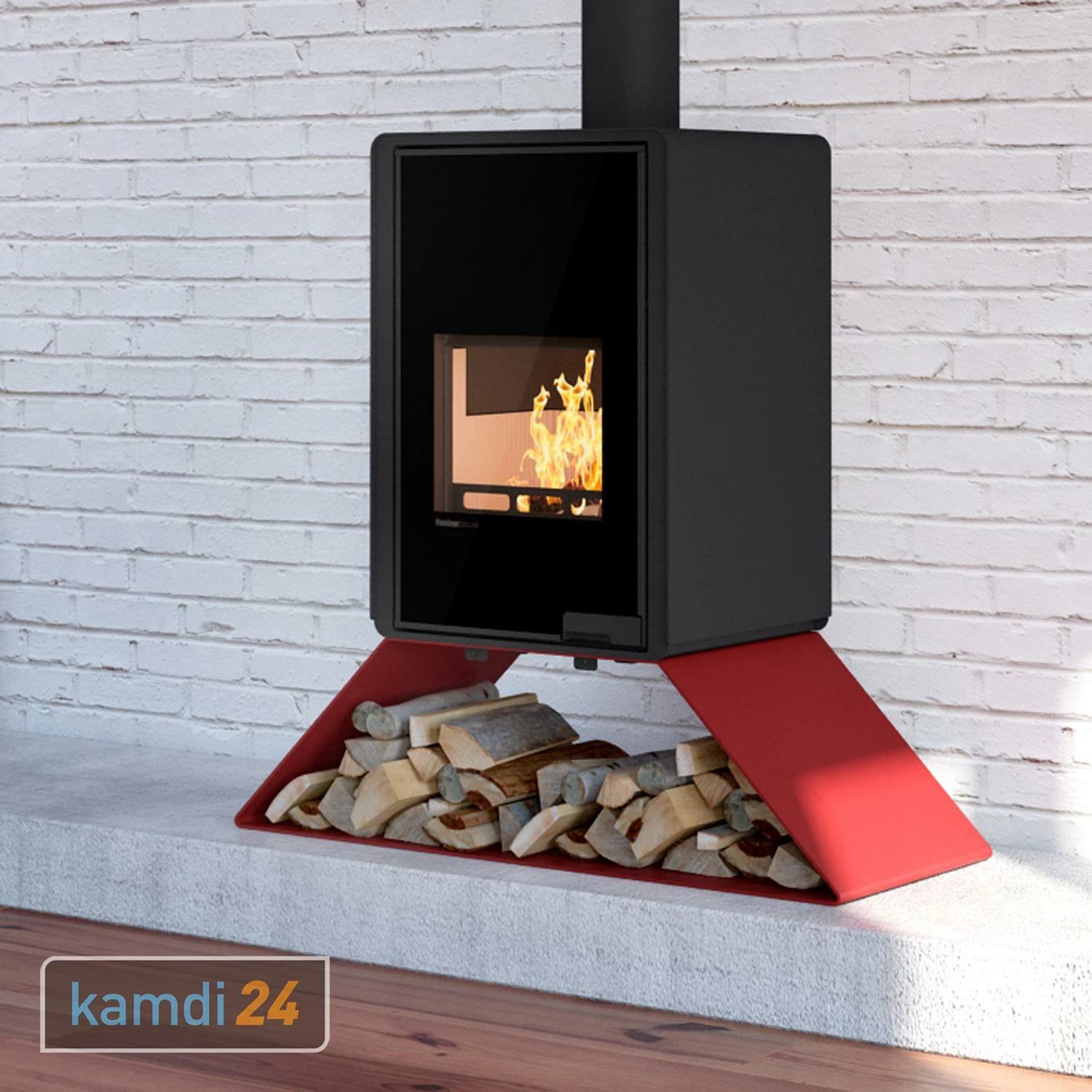 Der Holzofen besteht aus schwarzem Stahl und versprüht ein modernes Flair. Er wird auf ein offenes Design-Holzregal aufgestellt und erhält durch die Option der Brennstoffaufbewahrung einen rustikalen Touch. So vereint modernes Design mit einer romantischen Note.