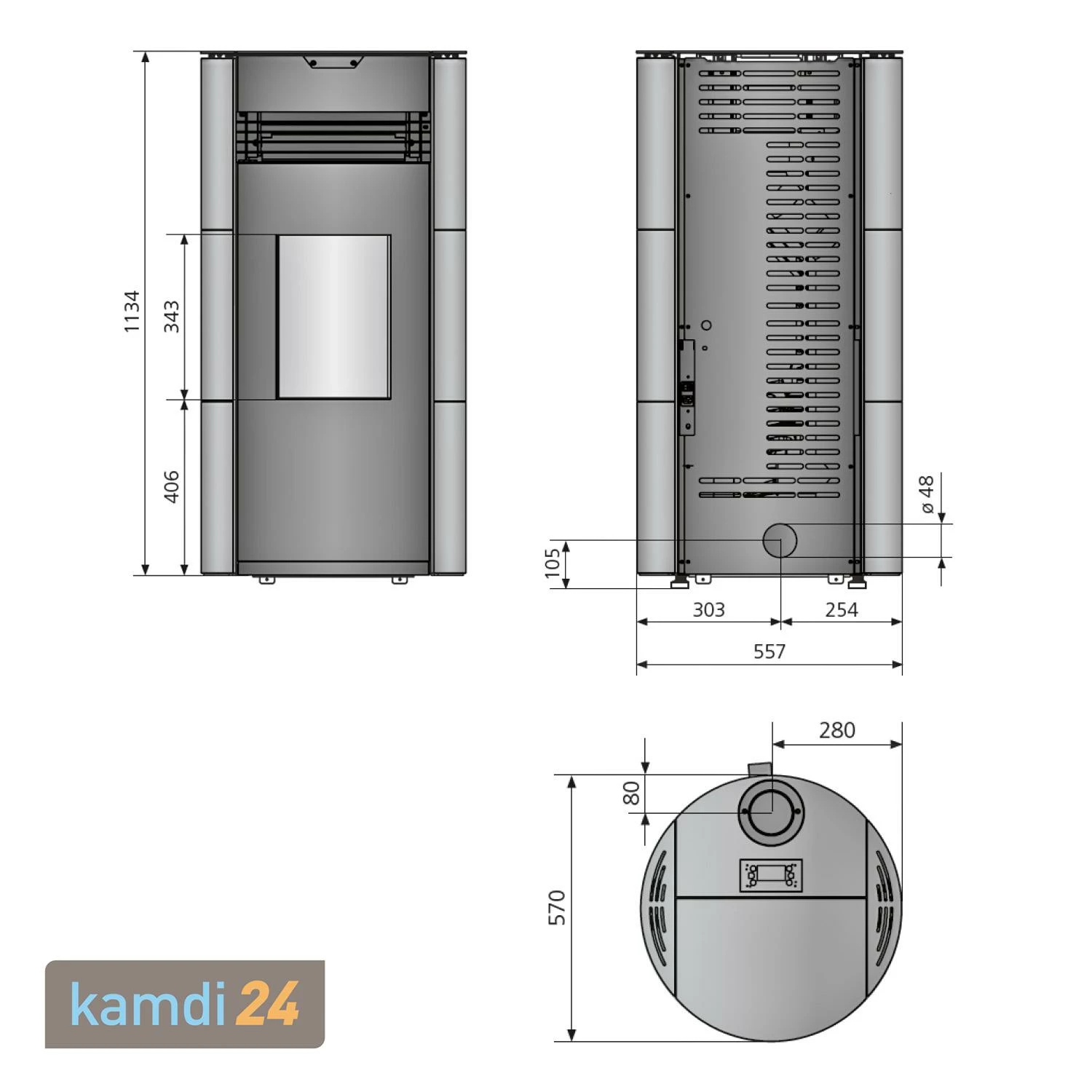 Der arbeitet raumluftabhängig im Konvektionsbetrieb, das heißt, die Umgebungsluft wird von den im Ofen verbauten Konvektionsschächten angesaugt, stark erwärmt und wieder an den Aufstellraum abgegeben. Bei Bedarf kann der Pelletofen mit einem Anschluss für eine externe Verbrennungsluftleitung ausgerüstet werden. Das macht vor allem bei besonders dichten Räumen, in denen der Sauerstoffgehalt gering ist, Sinn. Der Vorteil der externen Verbrennungsluftzuführung liegt etwa darin, dass nicht die erwärmte Raumluft zur Verbrennung herangezogen wird, sondern Frischluft aus dem Außenbereich. Der Anschlussstutzen für externe Verbrennungsluft befindet sich an der Rückseite des Ofens.