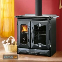 Der kompakte von beheizt Räume bis . Zwei und ein mit integriertem Thermometer machen zu einem reizvollen Küchenofen, der dank seiner edlen Verkleidung aus auch optisch perfekt in klassische und moderne Küchen passt. Eine im unteren Teil von kann zur komfortablen Lagerung des Brennholz-Nachschubs genutzt werden.