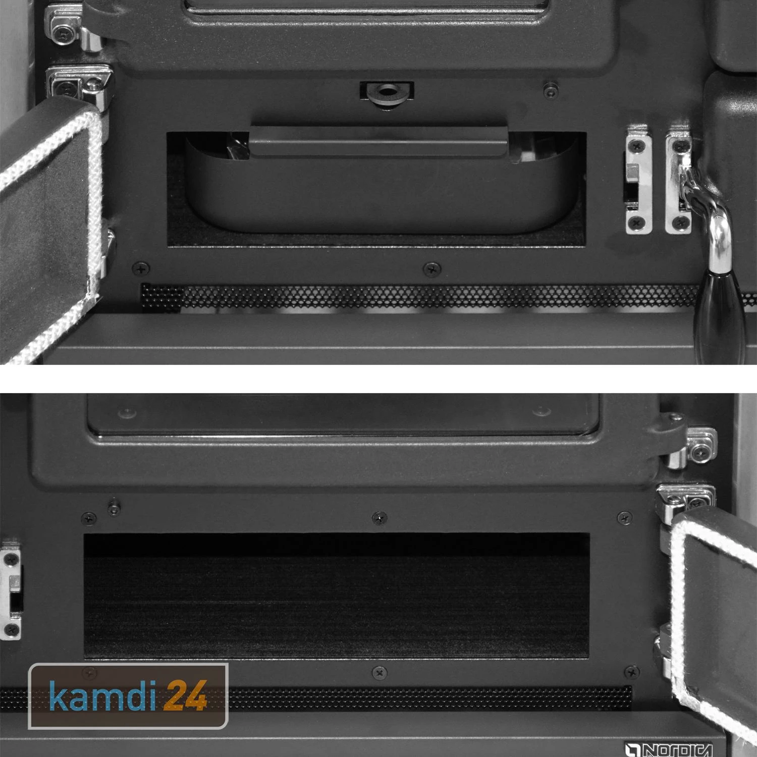 Eine große Schublade im unteren Teil von dient als Holzfach, sodass Sie immer ausreichend Brennstoff-Nachschub griffbereit haben.