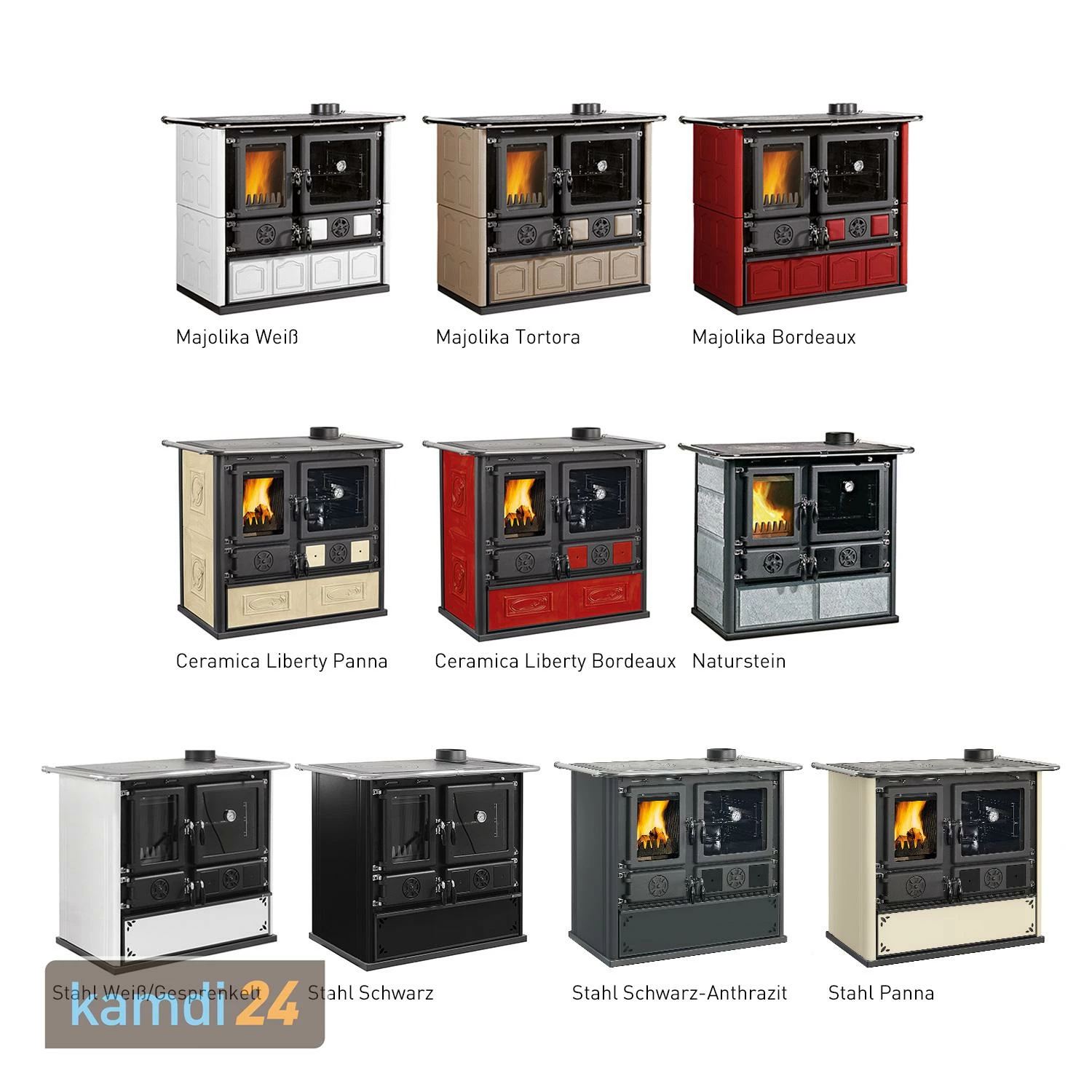 Der Küchenofen ist in einer Naturstein-Verkleidung erhältlich, die zeitlose Eleganz und warme Gemütlichkeit ausstrahlt. Für alle, die sich etwas Farbe in die Küche holen möchten, gibt es den hochwertigen Holzofen außerdem mit verschiedenen handgefertigten Majolika-Verkleidungen. Entdecken Sie die Varianten Bordeaux, Taubengrau (Tortora) und Weiß – und mit einem besonders edlen Muster die Varianten Liberty Bordeaux und Liberty Panna. Weiterhin erhalten Sie den schicken Ofen auch mit einer Stahl-Verkleidung in der Farbe Schwarz-Anthrazit oder in der Farbe Weiß gesprenkelt. Wählen Sie Ihr Lieblingsdesign über unser Varianten-Menü!