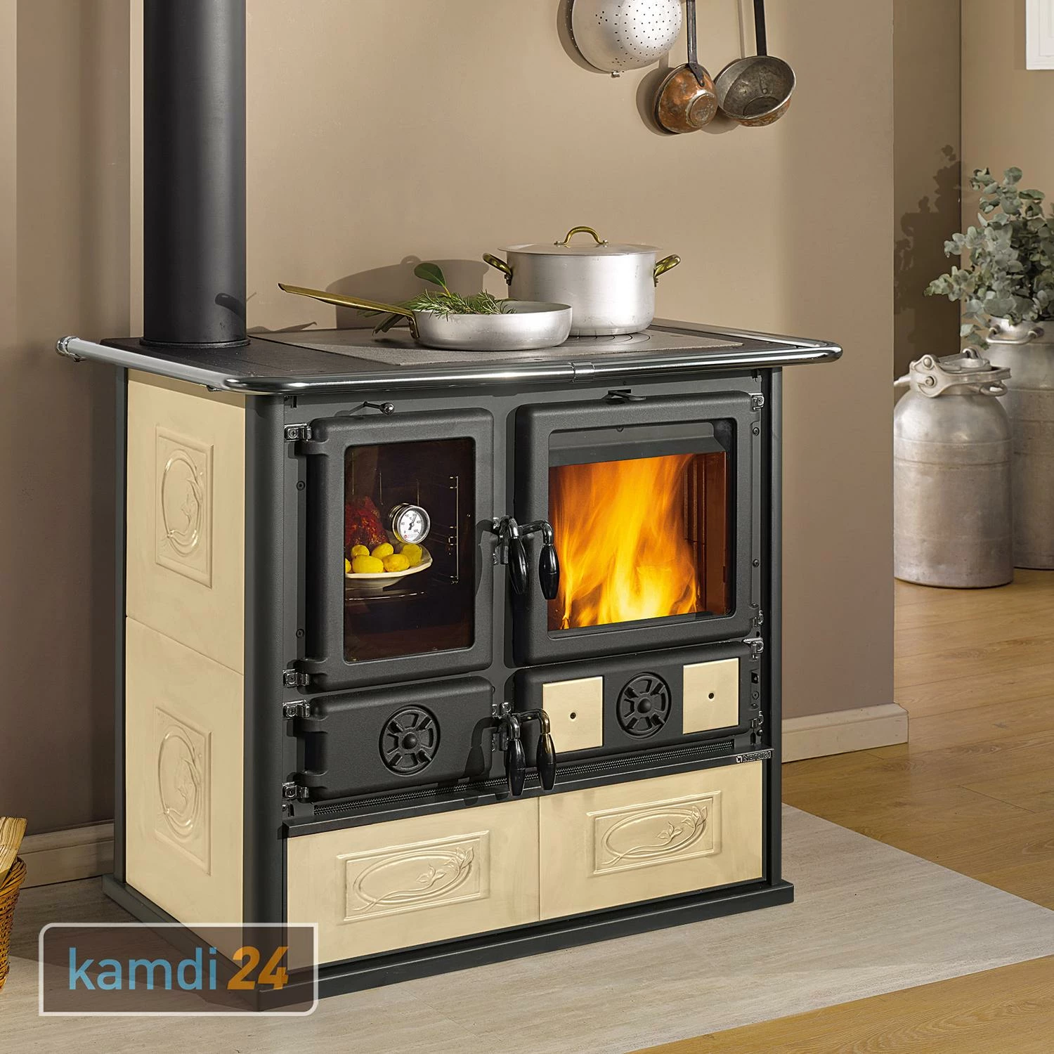 Mit kann der Küchenofen beheizen. Nützliche Details wie die , das in der Backfachtür integrierte , das unter dem Backfach und die umlaufende Reling vervollständigen den Ofen. Dank seines zeitlos schönen Designs bereichert er jede Kücheneinrichtung. Über das können Sie Ihren farblichen Favoriten wählen: Liberty Bordeaux oder Panna sowie Naturstein.