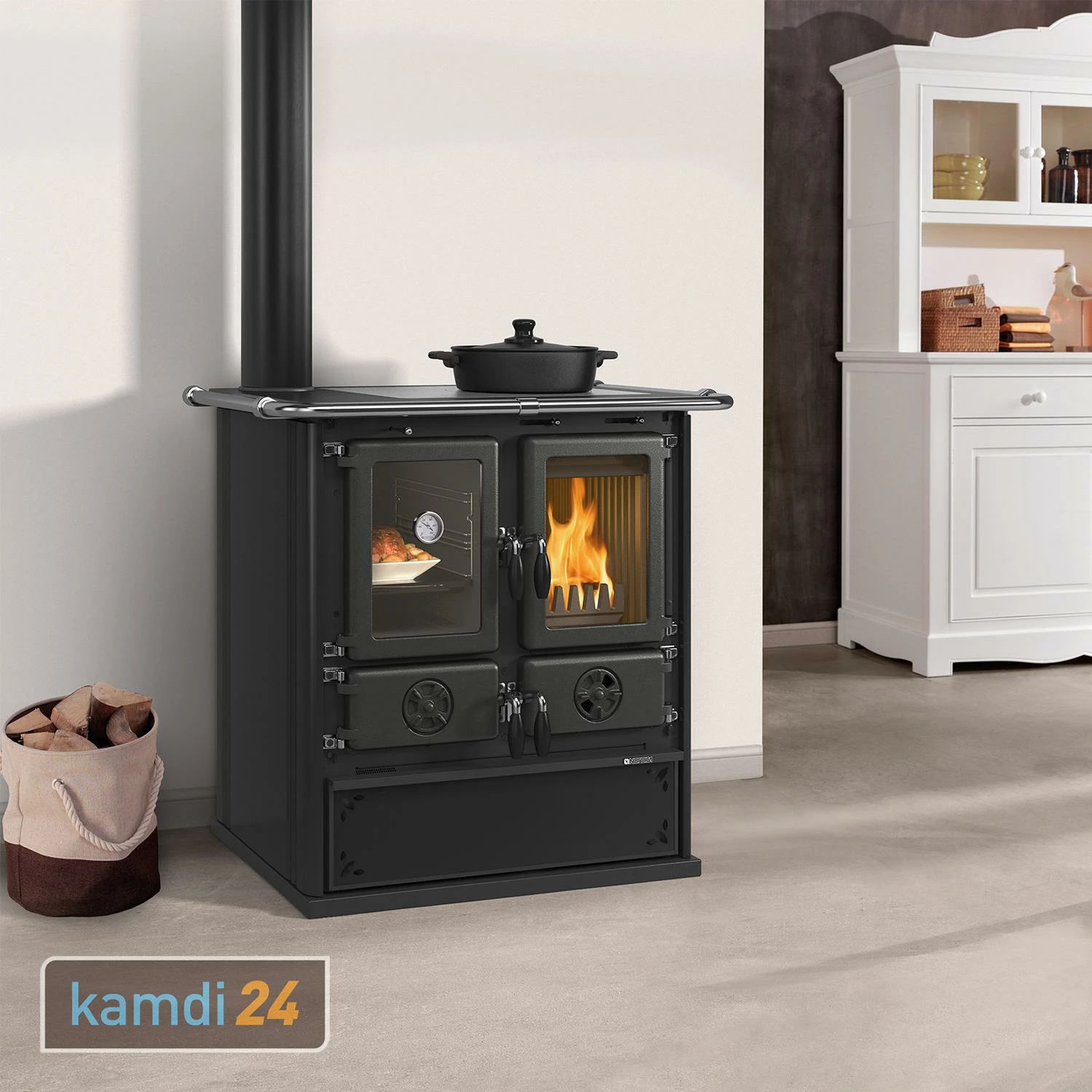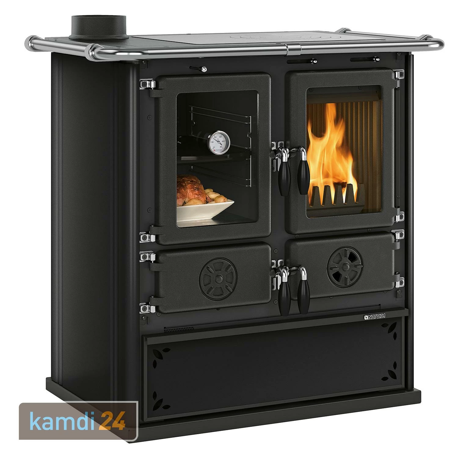 Wie seine Vorgänger besitzt auch dieses Modell eine große Kochfläche und Aussparung für ein Wasserschiff. Der Küchenofen verfügt weiterhin über ein linksseitiges mit eingebautem und einem rechtsseitigen für müheloses Beheizen von Räumen bis . Die integrierte sorgt für einen stets ungetrübten Blick auf das Flammenspiel. Unter dieser Ebene befinden sich das sowie der ausziehbare . Ganz unten, und ebenfalls herausziehbar, können Sie das verstauen.