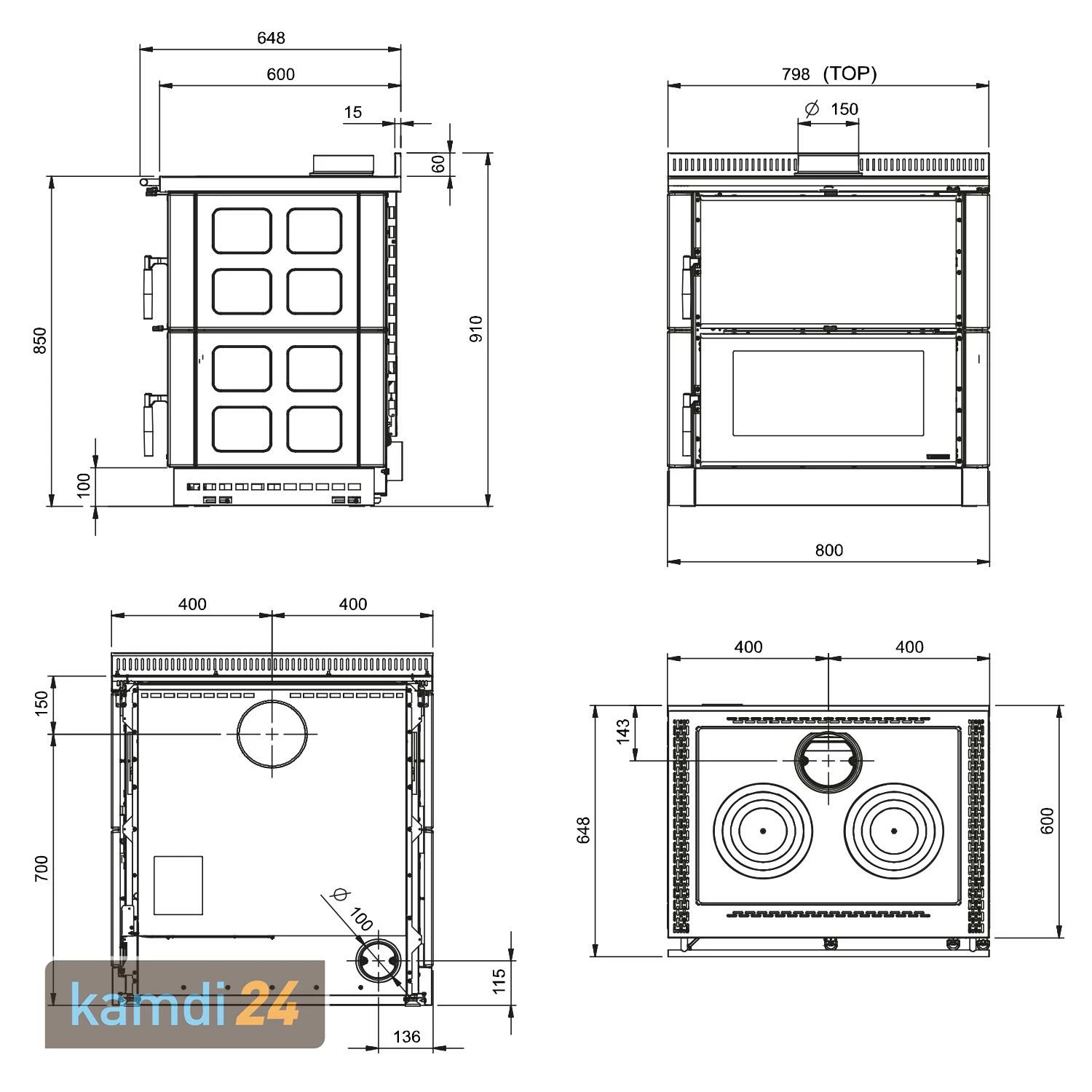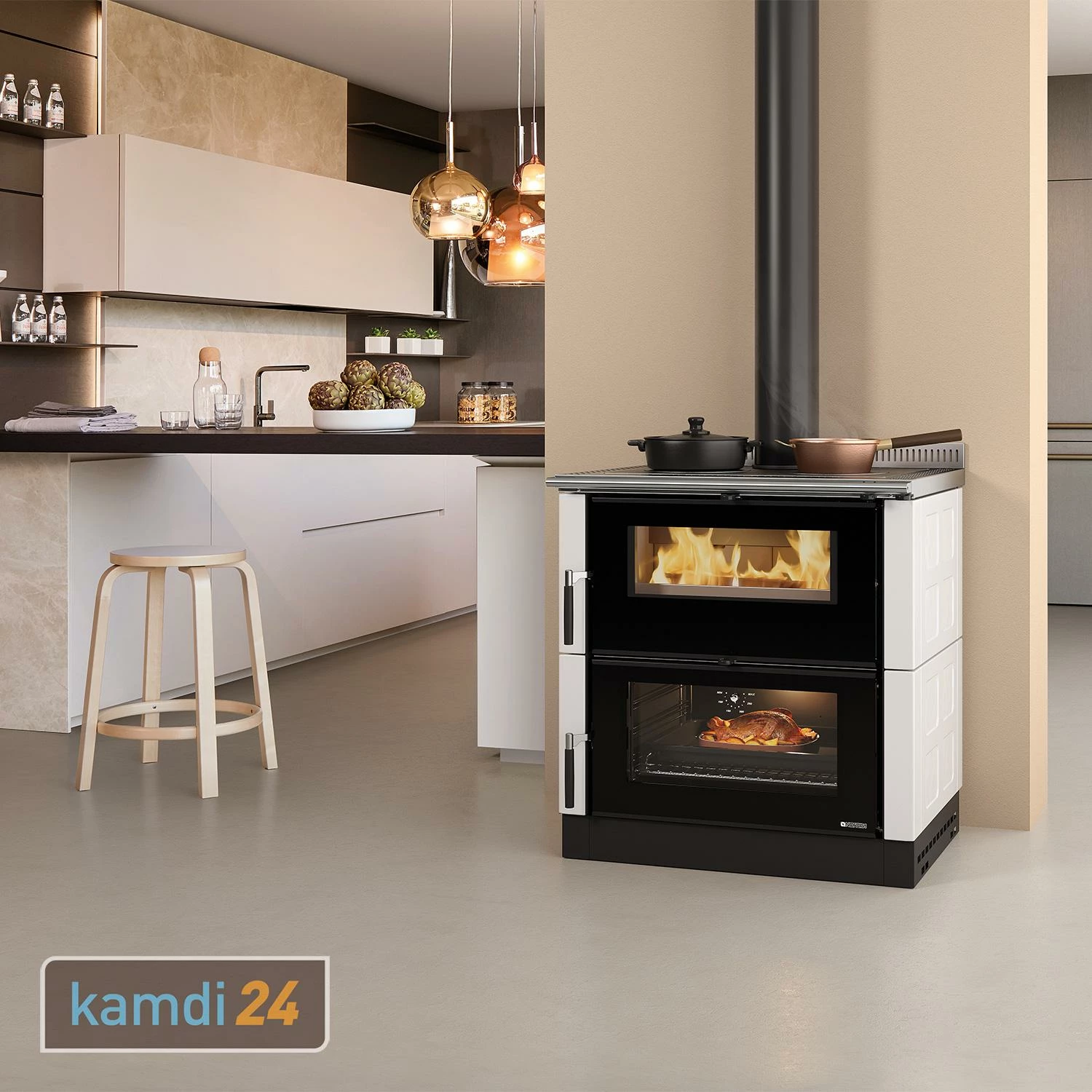 Der elegante Holzofen wird freistehend montiert, sodass Sie ihn nach Belieben platzieren können. Das ist vorteilhaft, wenn die Kücheneinrichtung individuell zusammengestellt werden soll und sich zudem der Schornsteinanschluss über einem anderen Zimmer befindet. So können Sie flexibel gestalten und eine Verbindung aus Wohn- und Kochbereich herstellen.
