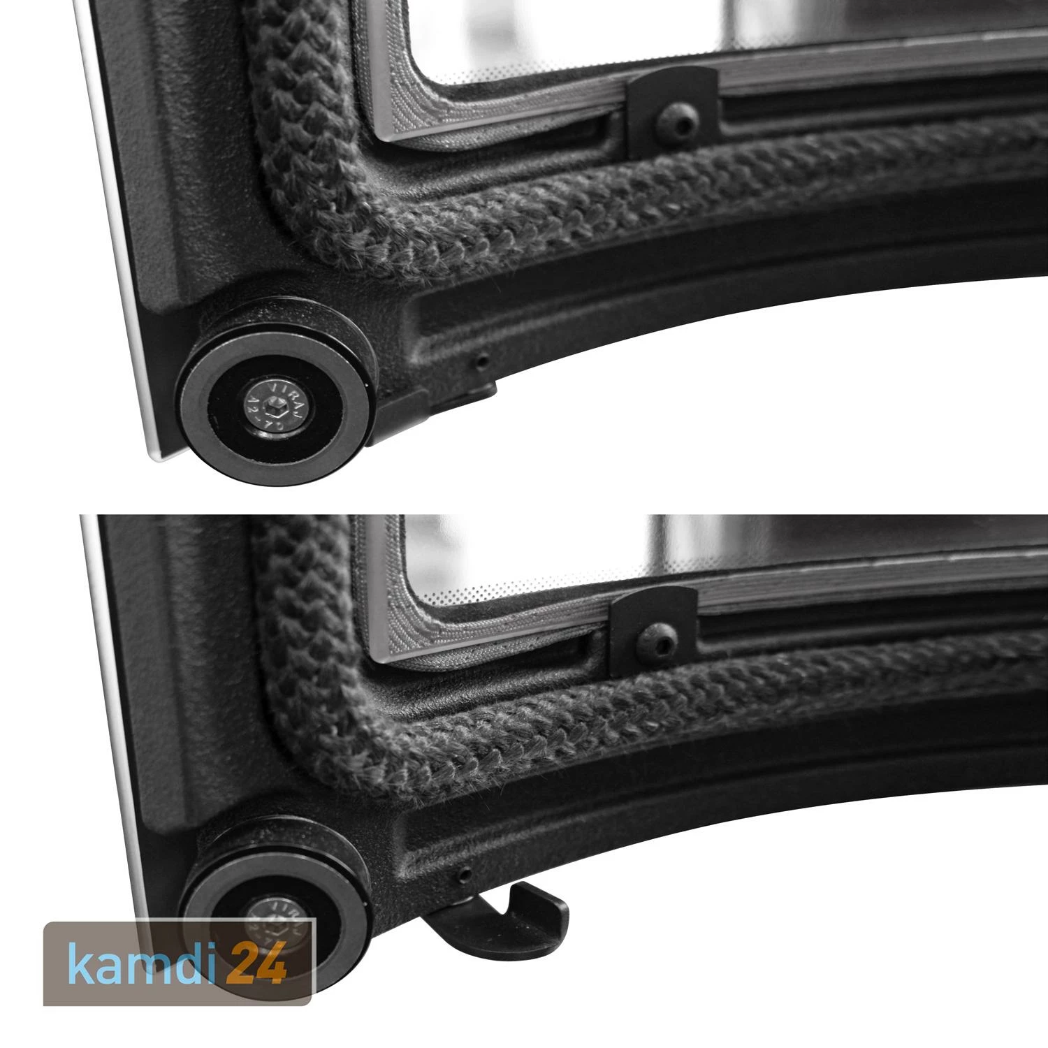 Der Kamin verfügt über ein , die Tür wird praktisch mit magnetischer Kraft angezogen. Die Brennraumtür von ist aus grauem Gusseisen gefertigt und mit einem Glaseinsatz ausgestattet, welcher einen guten Blick auf die Flammen erlaubt. Entscheiden Sie je nach Aufstellort, ob Ihr neuer seinen haben soll. Wenn Sie den hinteren Rauchrohranschluss nutzen wollen, bekommen Sie den passenden Steinsatz mit Rauchrohröffnung gleich mitgeliefert.Zudem können Sie über das Varianten-Menü wählen, ob Sie einen raumluftabhängigen Ofen oder die DIBt-geprüfte Variante bevorzugen.