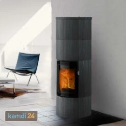 Die Verkleidung des von besteht aus dem Naturstein Indian Night. Dieser ist etwas dunkler als traditioneller Speckstein und setzt den Ofen sehr elegant in Szene. Nach dem Anheizen sorgt der schöne Kamin schnell für wohlige Wärme im Aufstellraum. Durch die hervorragenden Speichereigenschaften der Verkleidung und des Speichersteins gibt noch lange nach dem Abbrand Wärme an den Raum ab.
