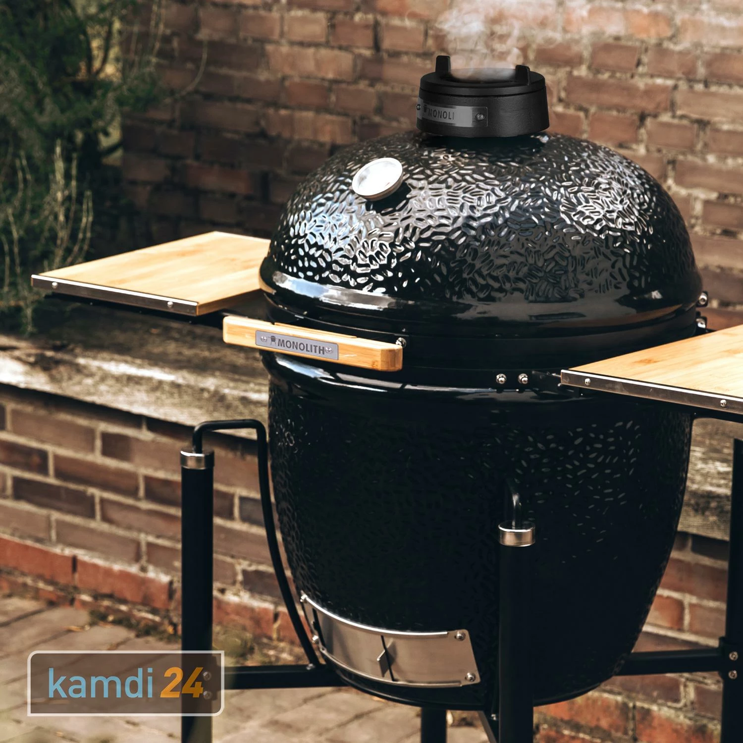 Für das entspannte Grillen im Garten oder auf der Terrasse besitzt dieser MONOLITH-Keramikgrill ein Gestell aus pulverbeschichtetem Metall mit zwei Seitentischen aus feinstem Bambus. Dadurch befindet sich der Grill auf der passenden Arbeitshöhe und die Seitentische bieten Abstellmöglichkeiten für Zutaten und Grillutensilien. Mit den arretierbaren Rädern am Gestell können Sie den leicht verschieben und sicher aufstellen.