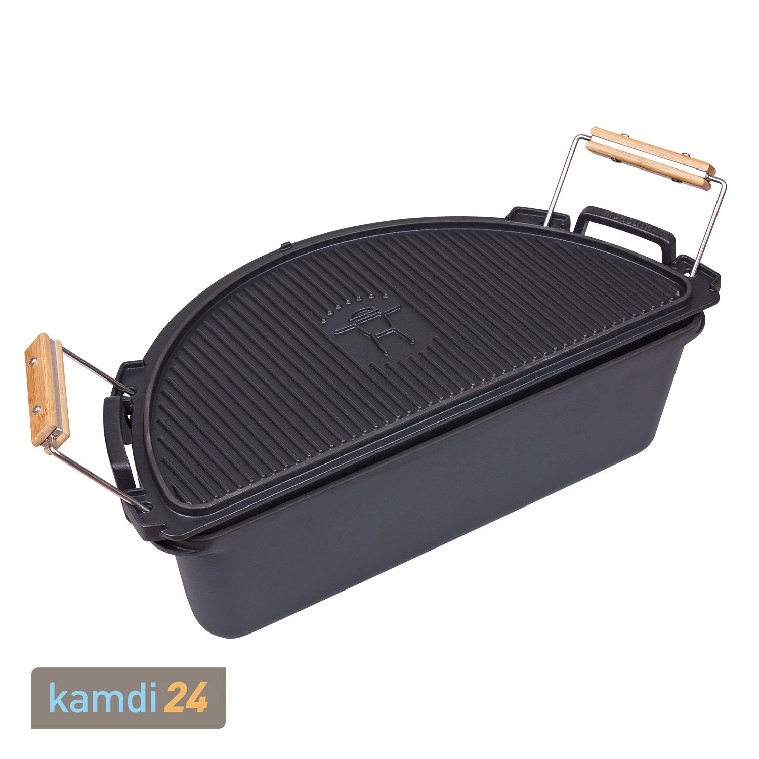 Der Deckel besitzt zwei unterschiedliche Oberflächen. Sie können ihn separat auch wie eine Plancha nutzen. Der innenliegende Rost aus Edelstahl schafft im Feuertopf eine zweite Ebene und erweitert so Ihre kulinarischen Möglichkeiten. Sie erhalten den in einer schweren, 4 mm starken Ausführung, schwarz emailliert.