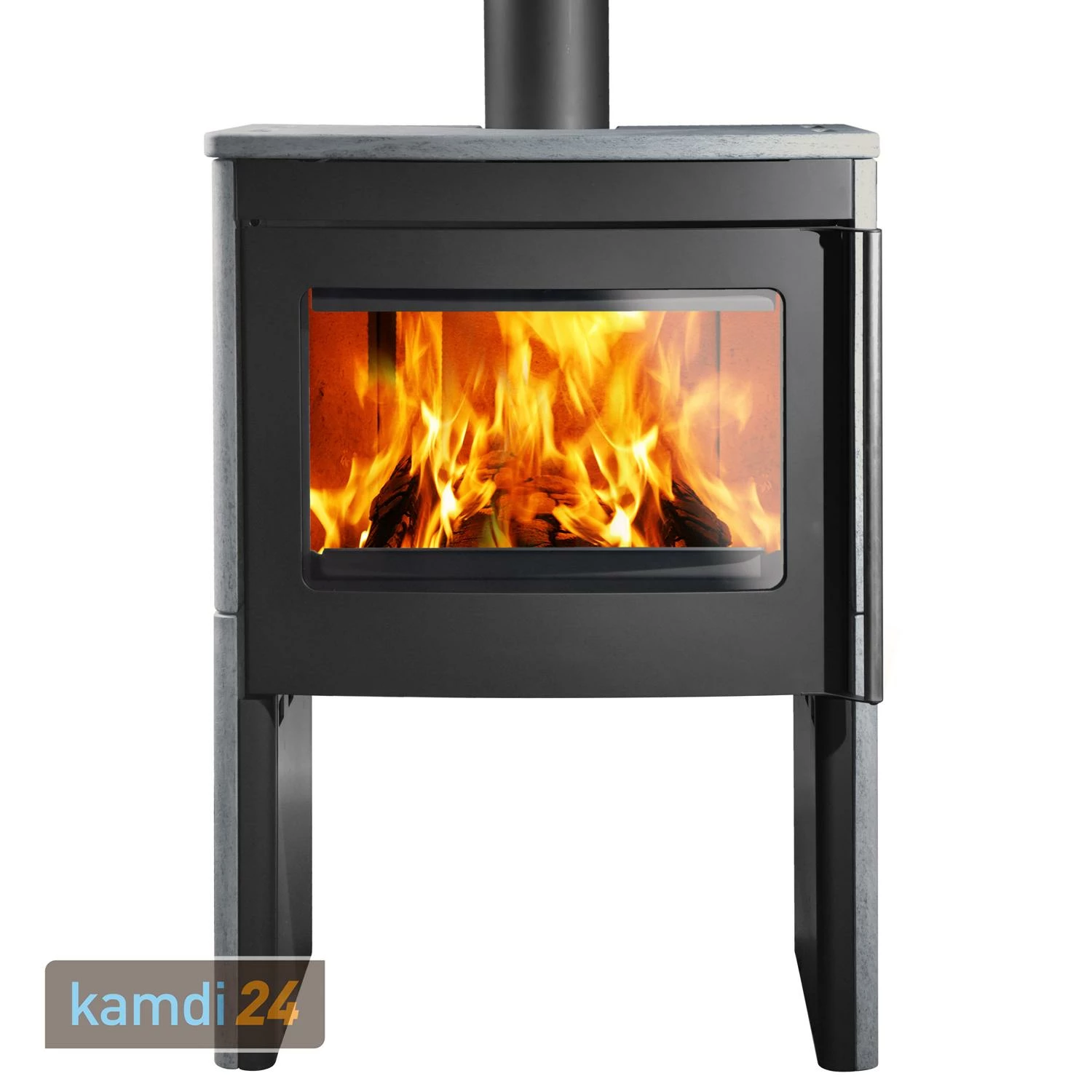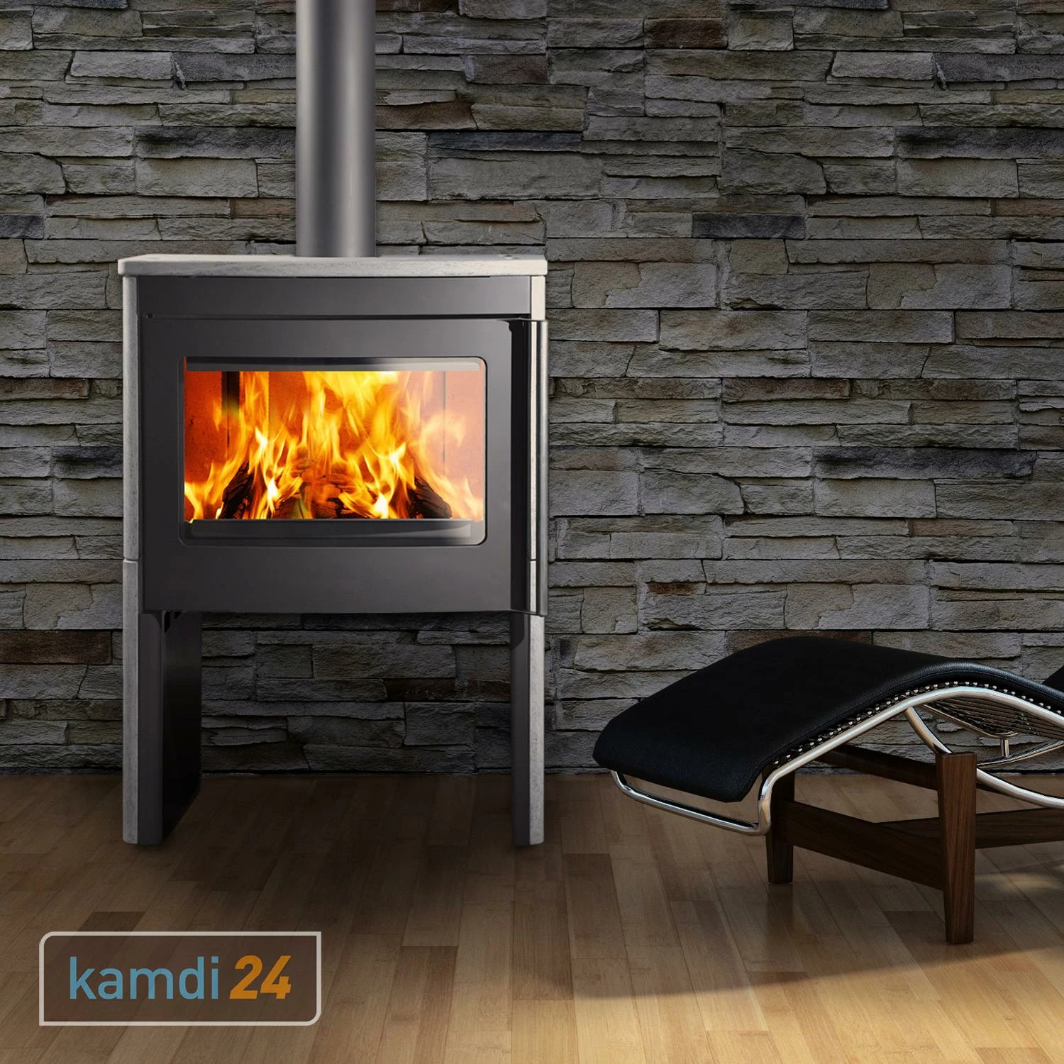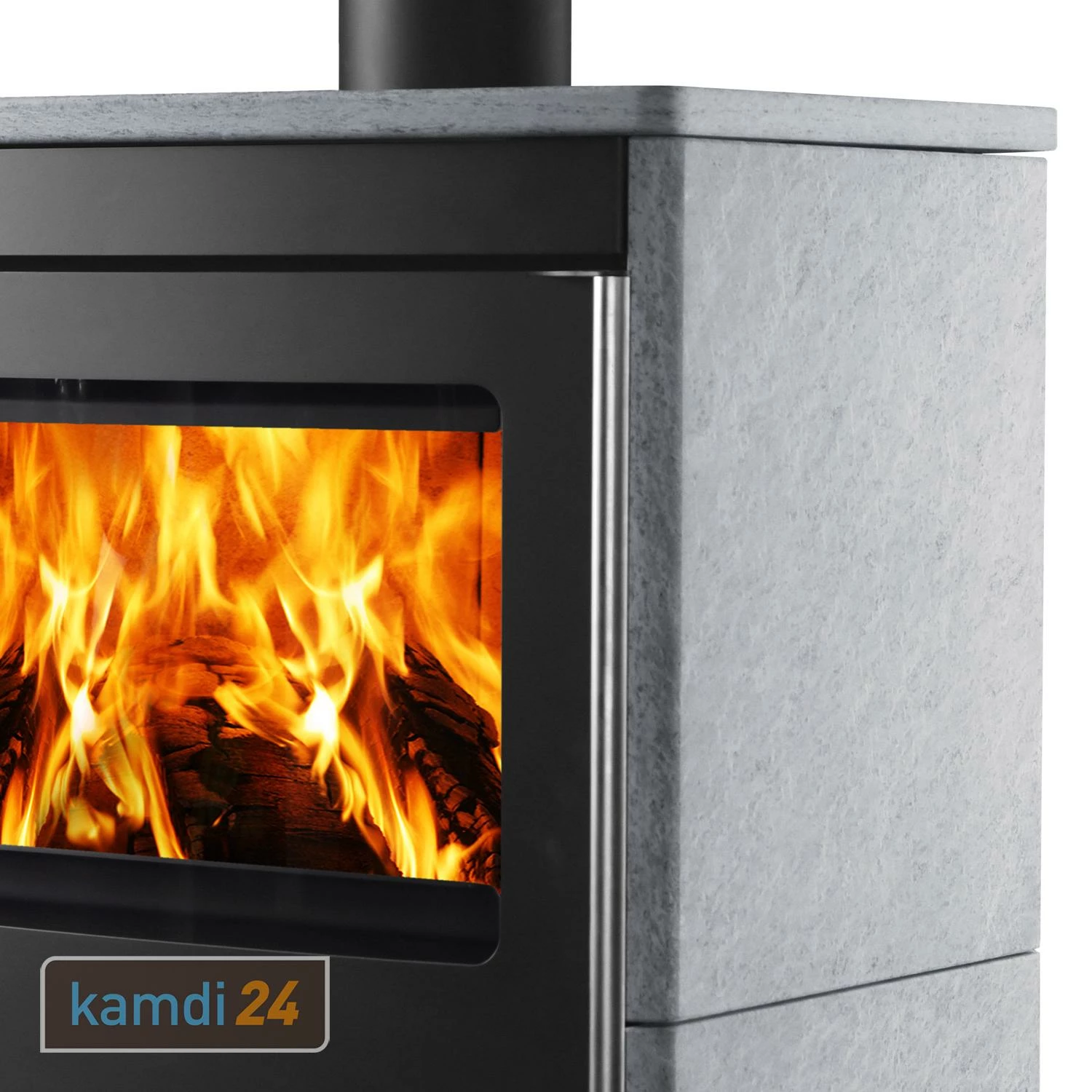 Der Kaminofen ist in zwei Varianten erhältlich, wobei der Korpus jeweils schwarz gestaltet wurde. Während in einer reinen Stahlverkleidung daherkommt, ist zusätzlich mit Naturstein (italienischer Serpentin) an den Seiten sowie der oberen Platte ausgestattet. Ihren Favoriten können Sie über das Varianten-Menü auswählen.