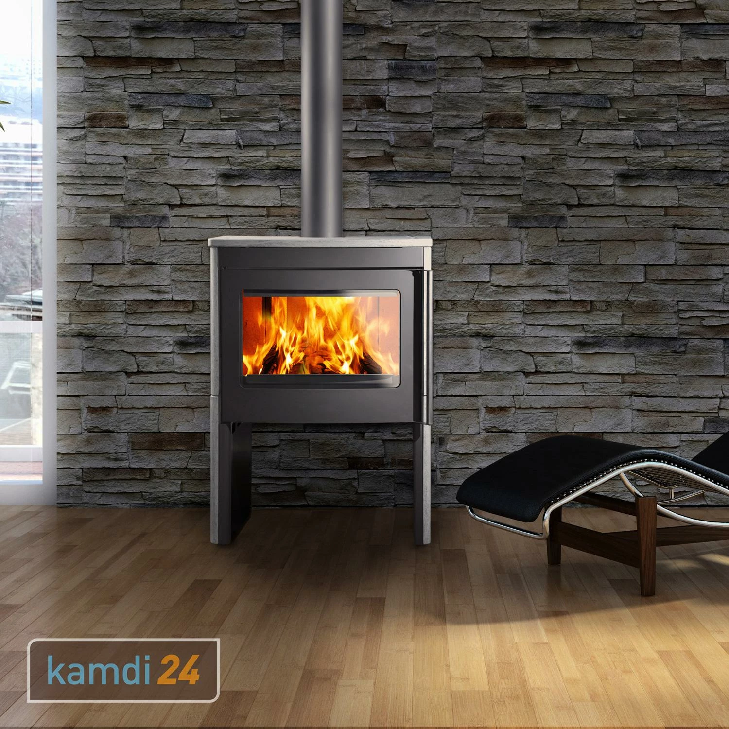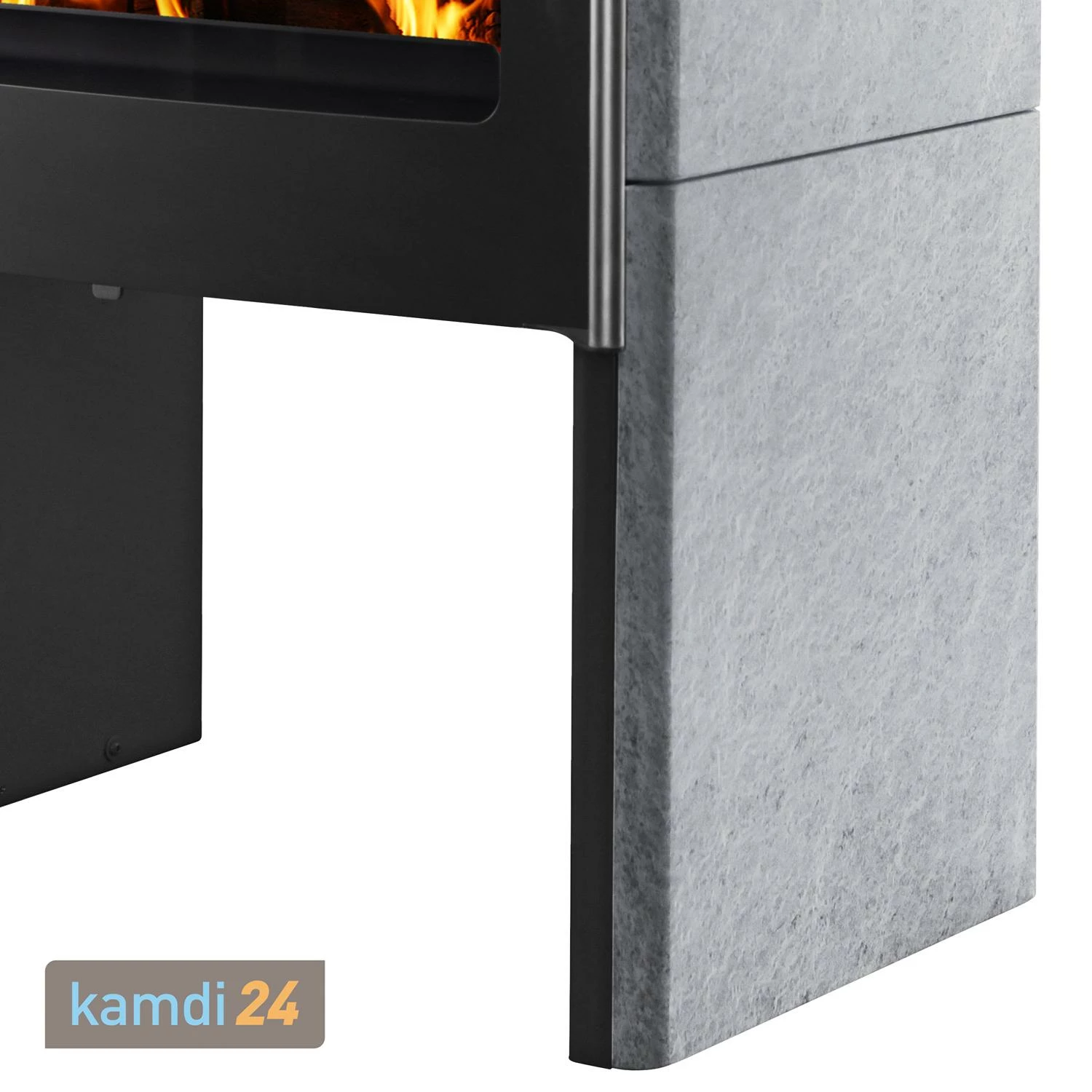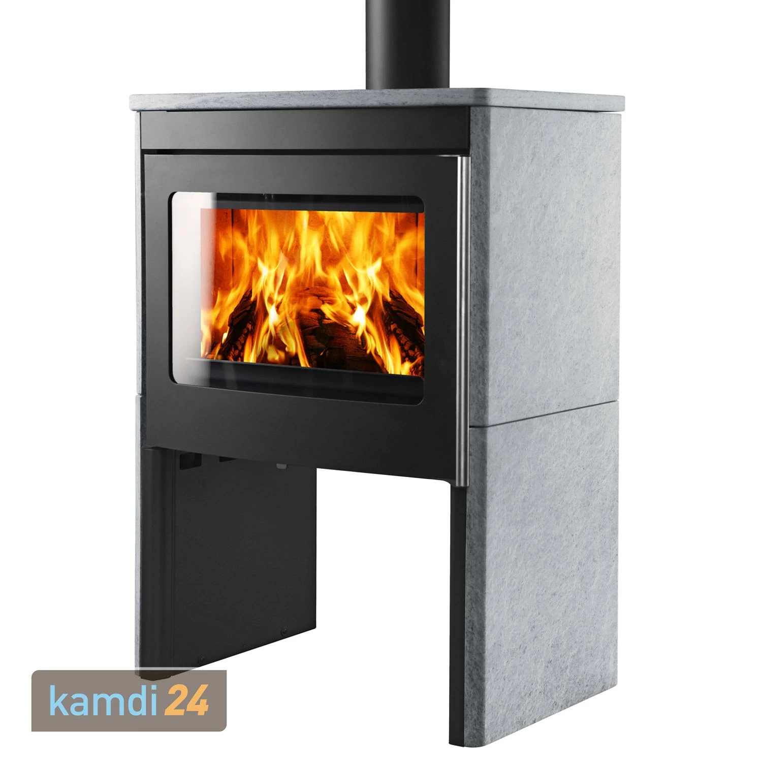 Der Kaminofen ist in zwei Varianten erhältlich, wobei der Korpus jeweils schwarz gestaltet wurde. Während in einer reinen Stahlverkleidung daherkommt, ist zusätzlich mit Naturstein (italienischer Serpentin) an den Seiten sowie der oberen Platte ausgestattet. Ihren Favoriten können Sie über das Varianten-Menü auswählen.