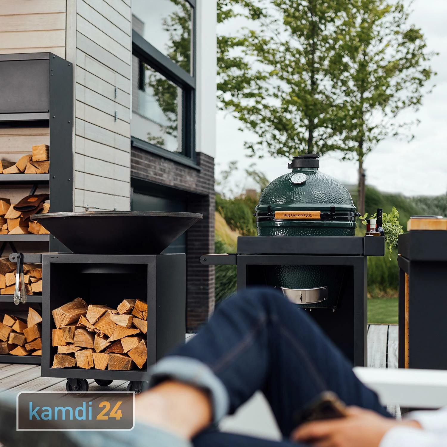 Die sind an einer Seite offen und ermöglichen die Lagerung des Brennholzes. Durch den Einsatz des Kamados ist der Stauraum jedoch begrenzt.
