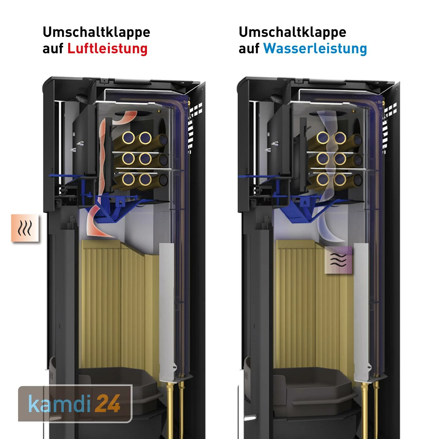 Der Nevado Aqua verfügt über eine mit der ein Teil der Wärmeleistung (ca. 1,5 kW) zwischen Wasser- und Luftleistung gewählt werden kann. Beim Anheizen wird die Umschaltklappe auf Luftleistung gestellt. Somit wird der Aufstellraum schnell und effizient erwärmt. Wenn die gewünschte Temperatur erreicht wurde, kann der Hebel wieder auf “Wasserleistung” zurückgestellt werden.