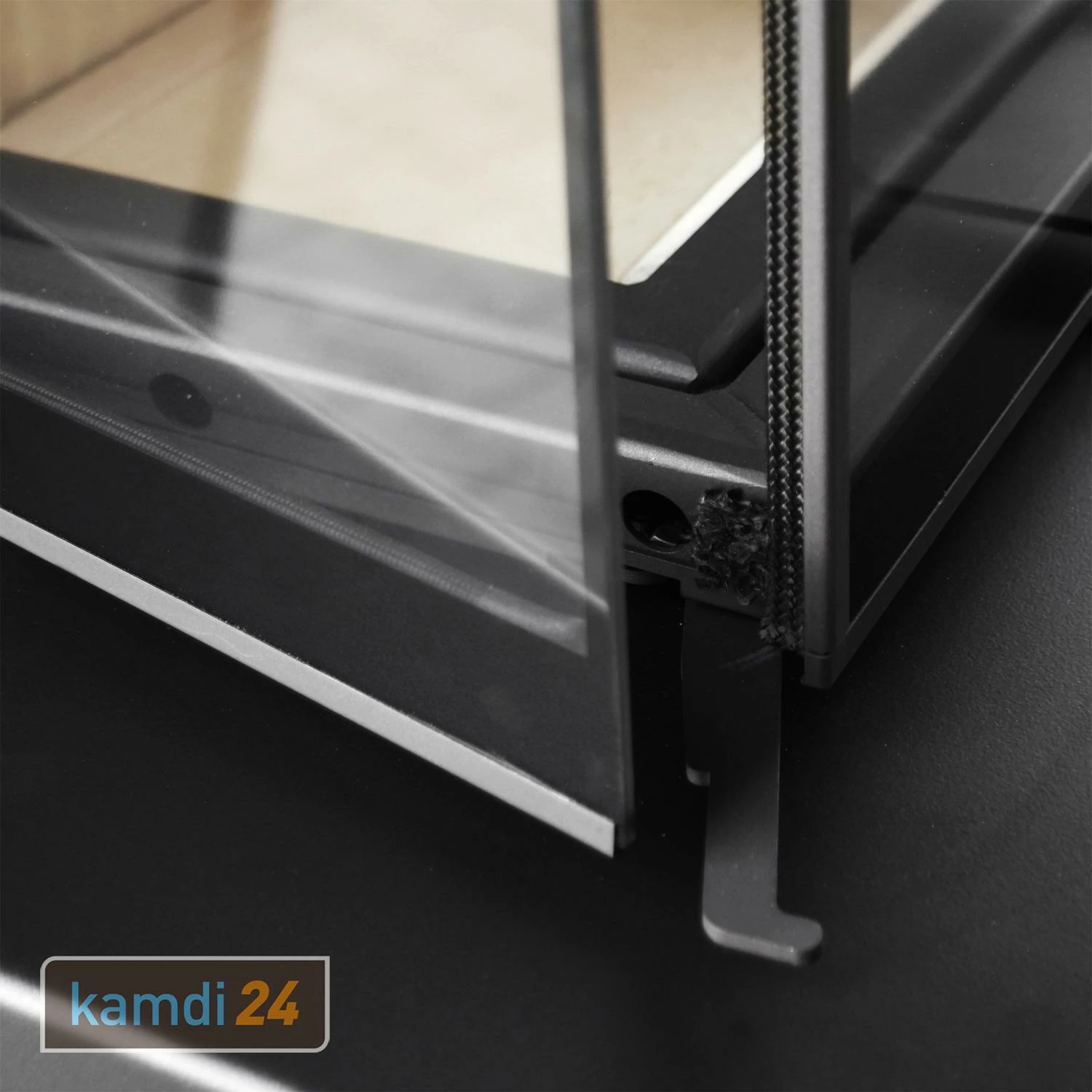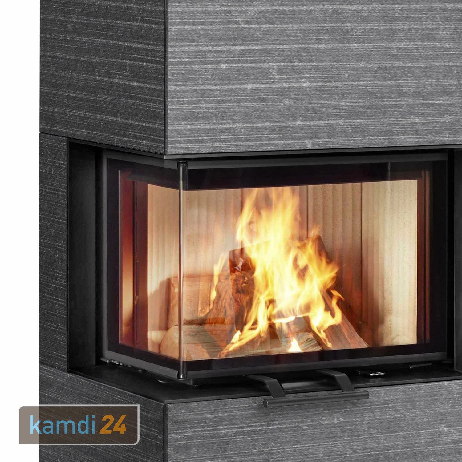 Der Holzofen ist mit einer selbstschließenden Schiebetür (Bauart 1) ausgestattet, die zum Nachlegen von Feuerholz bequem mit einem Handgriff nach oben geschoben wird. Zur Reinigung der Sichtscheibe lassen sich die Seitenflügel der Tür nach außen aufklappen.