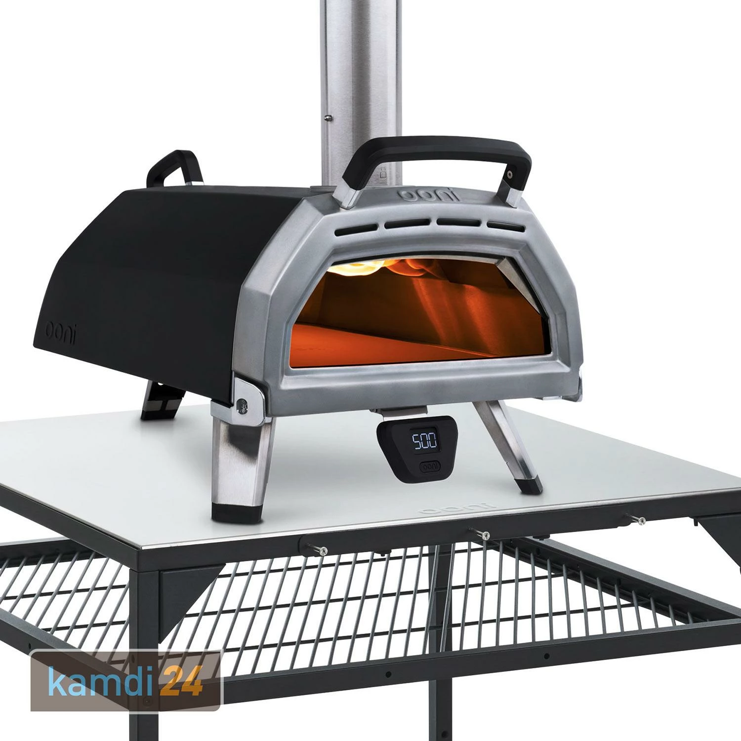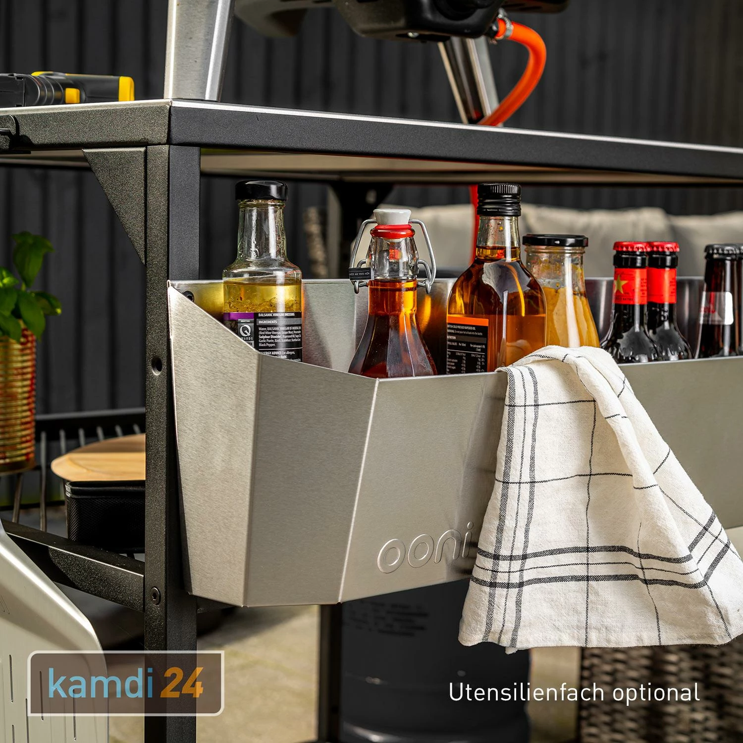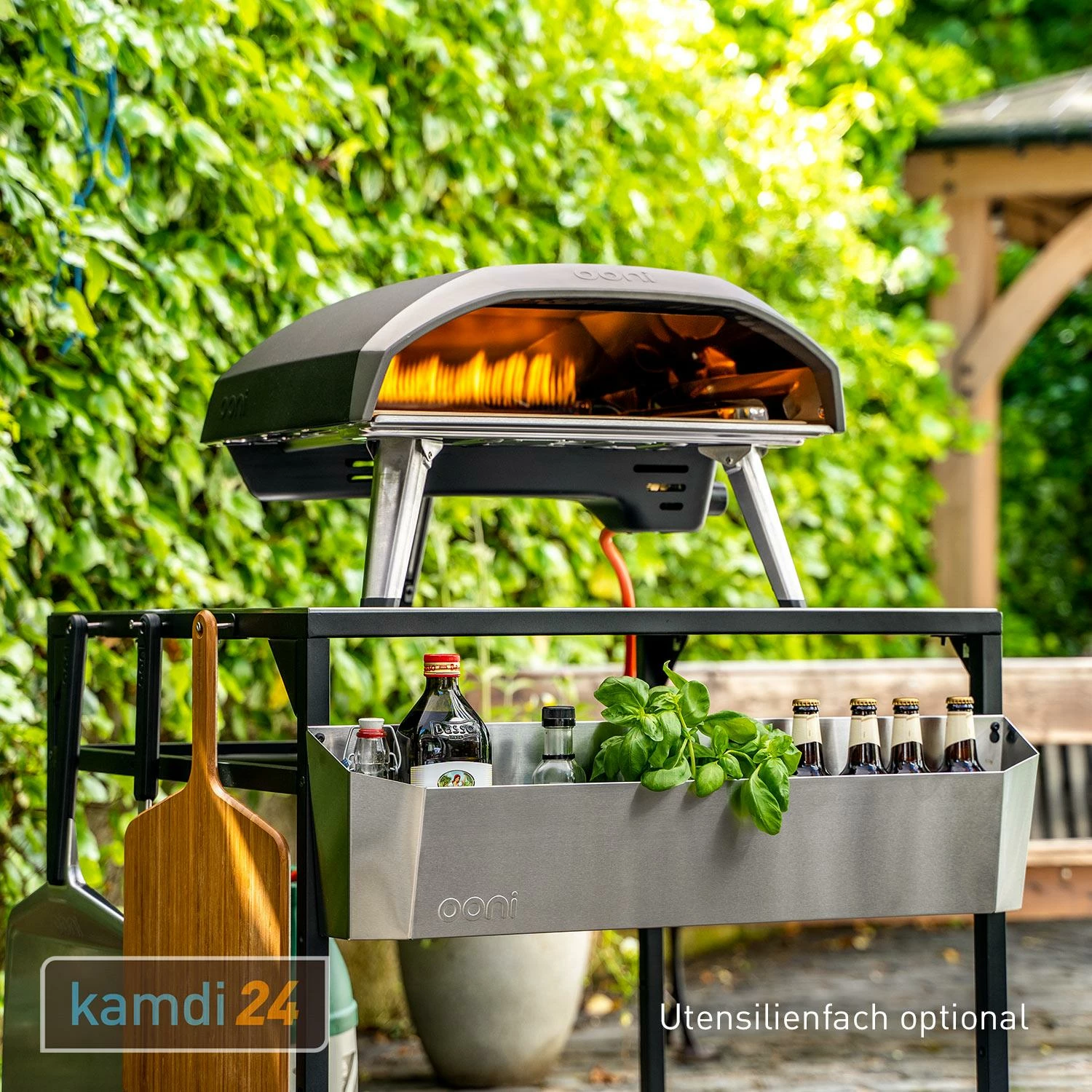 Der von ist die ideale Standfläche für Ihren Pizzaofen. Auf der Arbeitsfläche aus Edelstahl finden Ihr Pizzaofen von Ooni sowie Zubehör problemlos Platz. Auf der unteren Ablage können Sie z. B. eine Gasflasche abstellen. Die insgesamt zwei Böden sind höhenverstellbar. An der Außenseite befindet sich eine Hakenleiste an welcher Sie Zubehör griffbereit aufhängen können. Dank der Rollen lässt sich der gut bewegen und an den optimalen Standort bringen. Für einen sicheren Stand sorgen die feststellbaren Rollen.