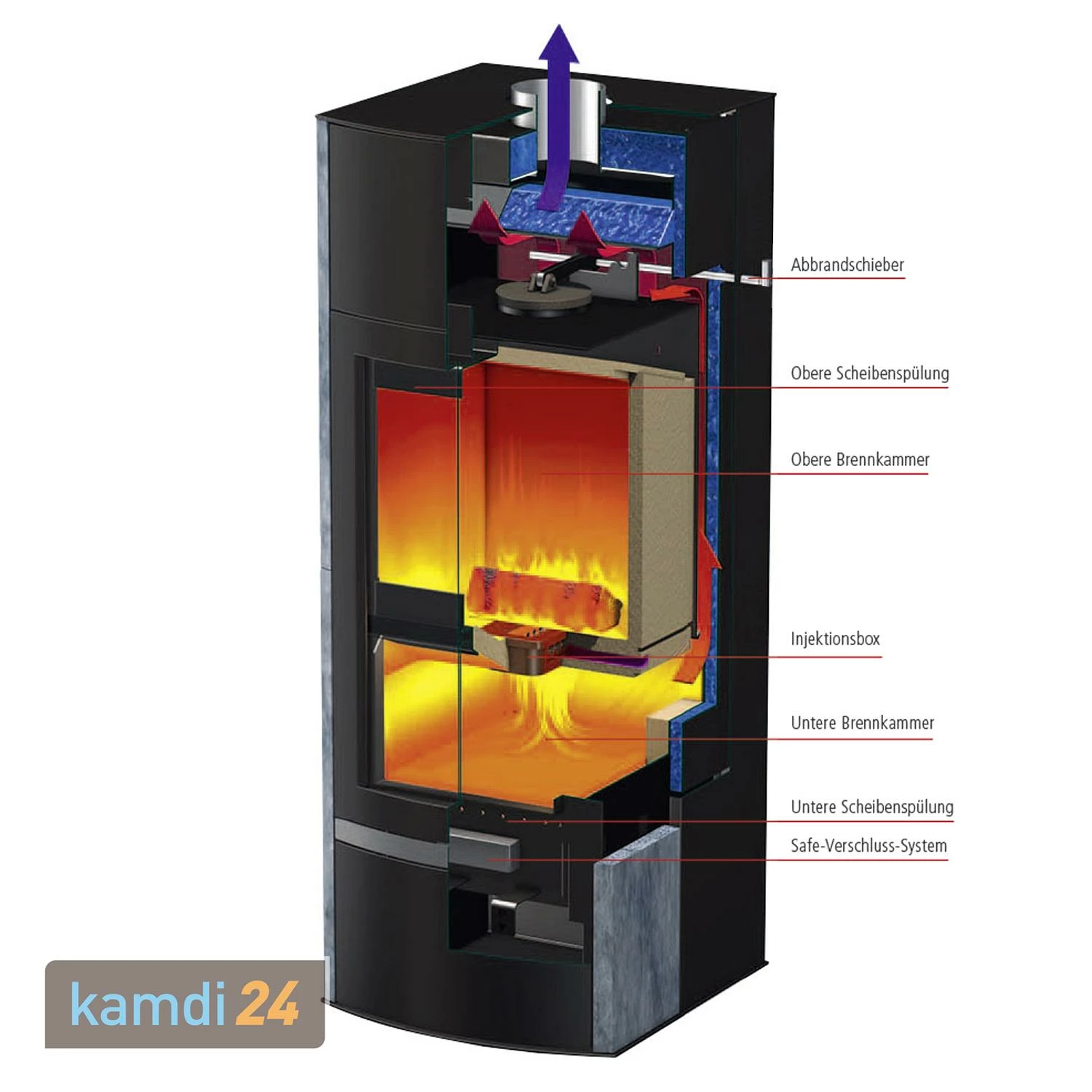 Zu Beginn entzünden Sie eine Ladung Holz in der oberen Brennkammer, wie bei einem normalen Kaminofen. Sobald das Holz bis zur Glut heruntergebrannt ist, legen Sie nach und schließen den Abbrandschieber. Der natürliche Schornsteinzug zieht die bereits freigesetzten, energiereichen Holzgase nun durch die Injektionsbox in die untere Brennkammer, in der die Nachverbrennung stattfindet. In der unteren Brennkammer werden auf diese Weise Temperaturen bis zu 1000 °C erreicht! Das Ergebnis ist eine besonders schadstoffarme Verbrennung, ein sehr hoher Wirkungsgrad und ein verhältnismäßig geringes Ascheaufkommen.