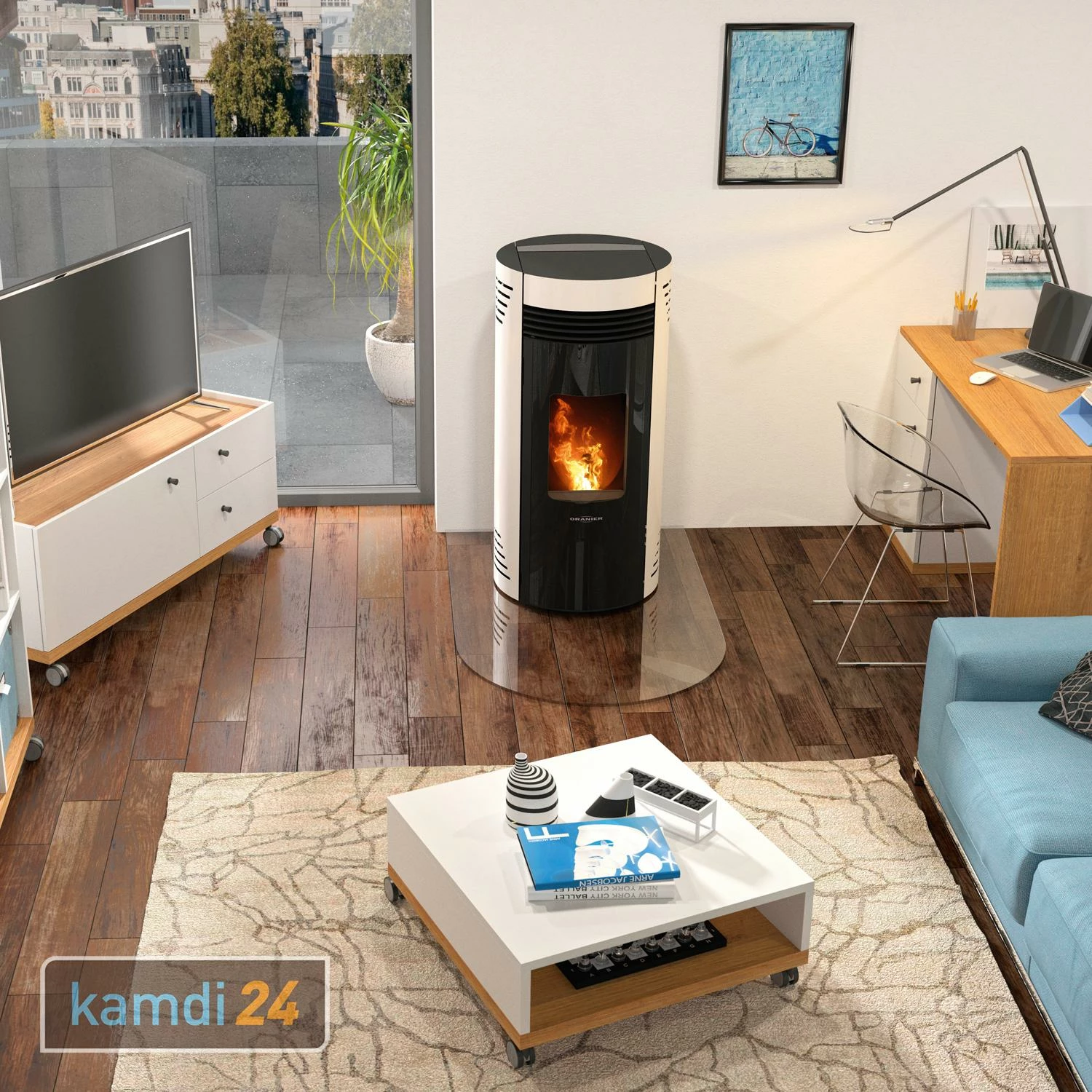 Die Bedienung erfolgt über das Touch-Display oder die Fernbedienung, die bereits im Lieferumfang enthalten ist. Darüber hinaus können Sie auch mittels einer WiFi-App über Ihr Smartphone steuern. Das hierzu benötigte ist ebenfalls inklusive. Der Pelletofen regelt die Leistung in Abhängigkeit von der Umgebungstemperatur. verfügt zudem über eine automatische Zündung und eine Wochenprogrammierung, mit welcher Sie bequem voreinstellen können, wann der Ofen sich an- und ausschalten soll. In den kann bis zu eingefüllt werden, damit erreicht der Ofen eine Brenndauer von bis zu . Dank der höhenverstellbaren Füße lässt er sich perfekt austarieren und durch die Panorama-Scheibe genießen Sie einen schönen Blick auf die Flammen.