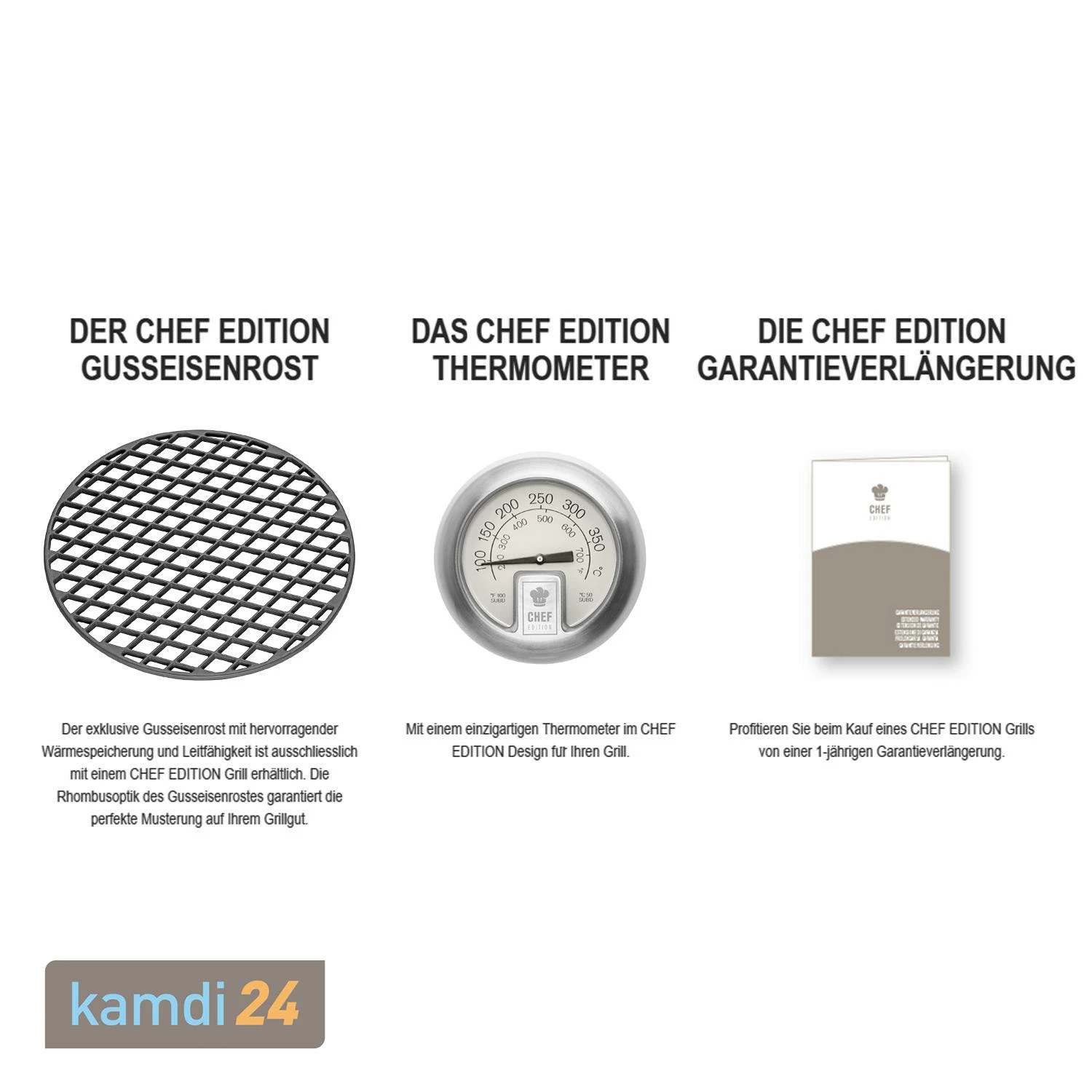 Mit dem von rüsten Sie Ihren zusätzlich auf. Neben dem exklusiven Deckelthermometer in der Chef Edition Version erhalten Sie einen hochwertigen aus Gusseisen. In diesem Set enthalten ist auch eine Chef Edition Garantieverlängerung* für Ihren Chef Edition Grill.