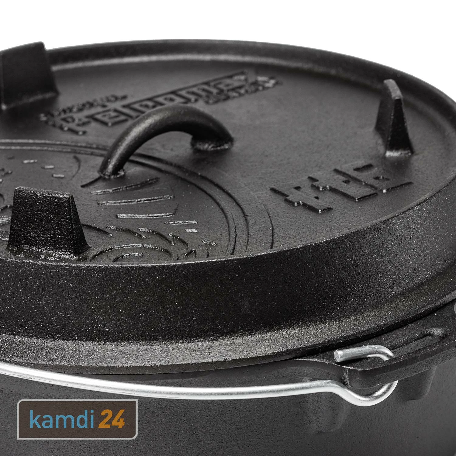 Auf dem Deckel von befinden sich drei gusseiserne Füße, die den Deckel zur Grill- und Servierplatte machen.