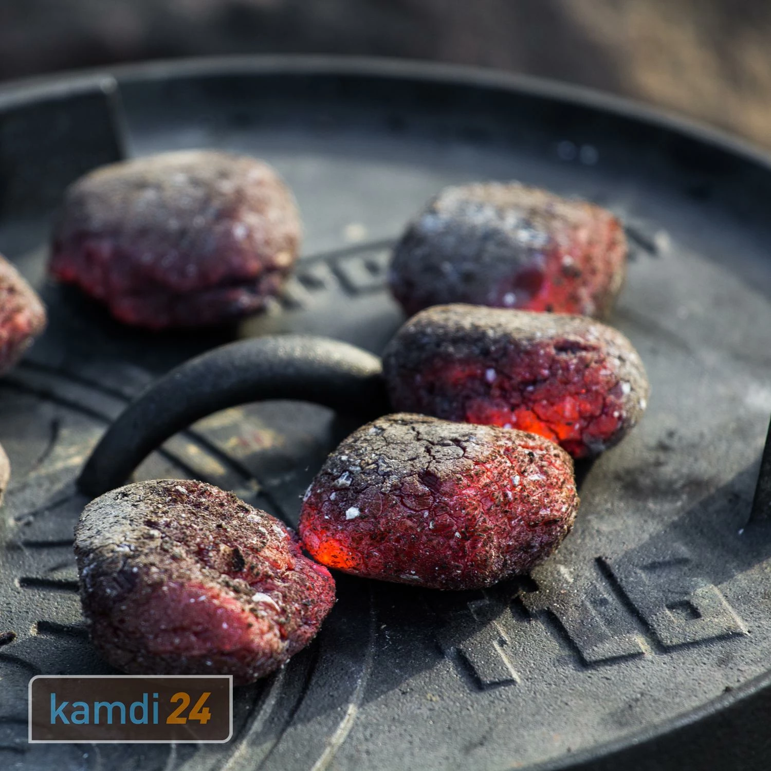 ist mit drei massiven Standfüßen versehen, sodass er auf einem Kohle-Bett nicht kippelt. Dank einer speziellen Vorbehandlung (“seasoned finish”) ist der Feuertopf sofort einsatzbereit.
