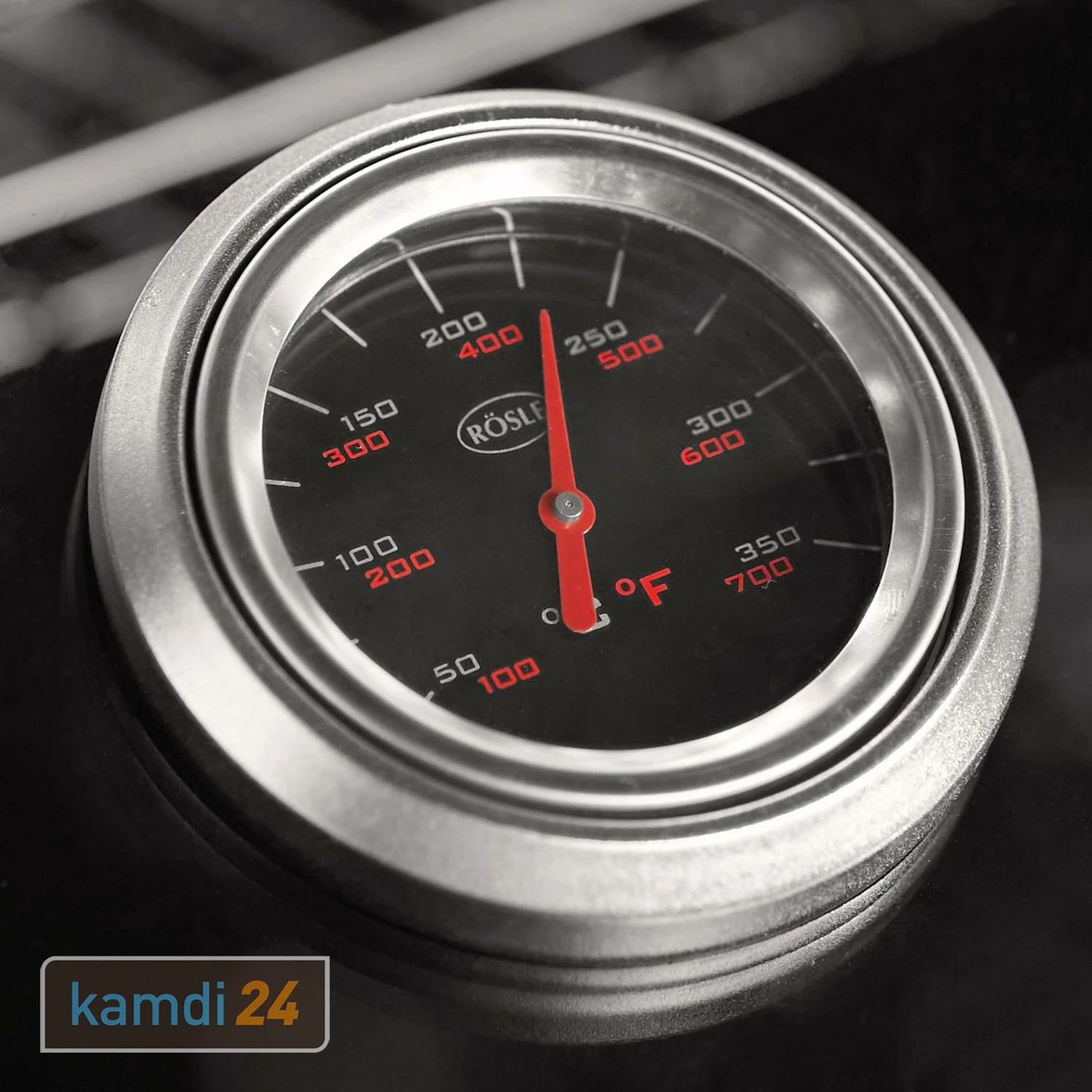 Dank der geschickten Konstruktion des Deckels mit Sichtfenster haben Sie das Grillgut immer im Blick, ohne den Deckel zu öffnen und damit einen Hitzeverlust im Garraum zu bewirken. Ein gut ablesbares Thermometer zeigt die Grilltemperatur in °C und °F an.