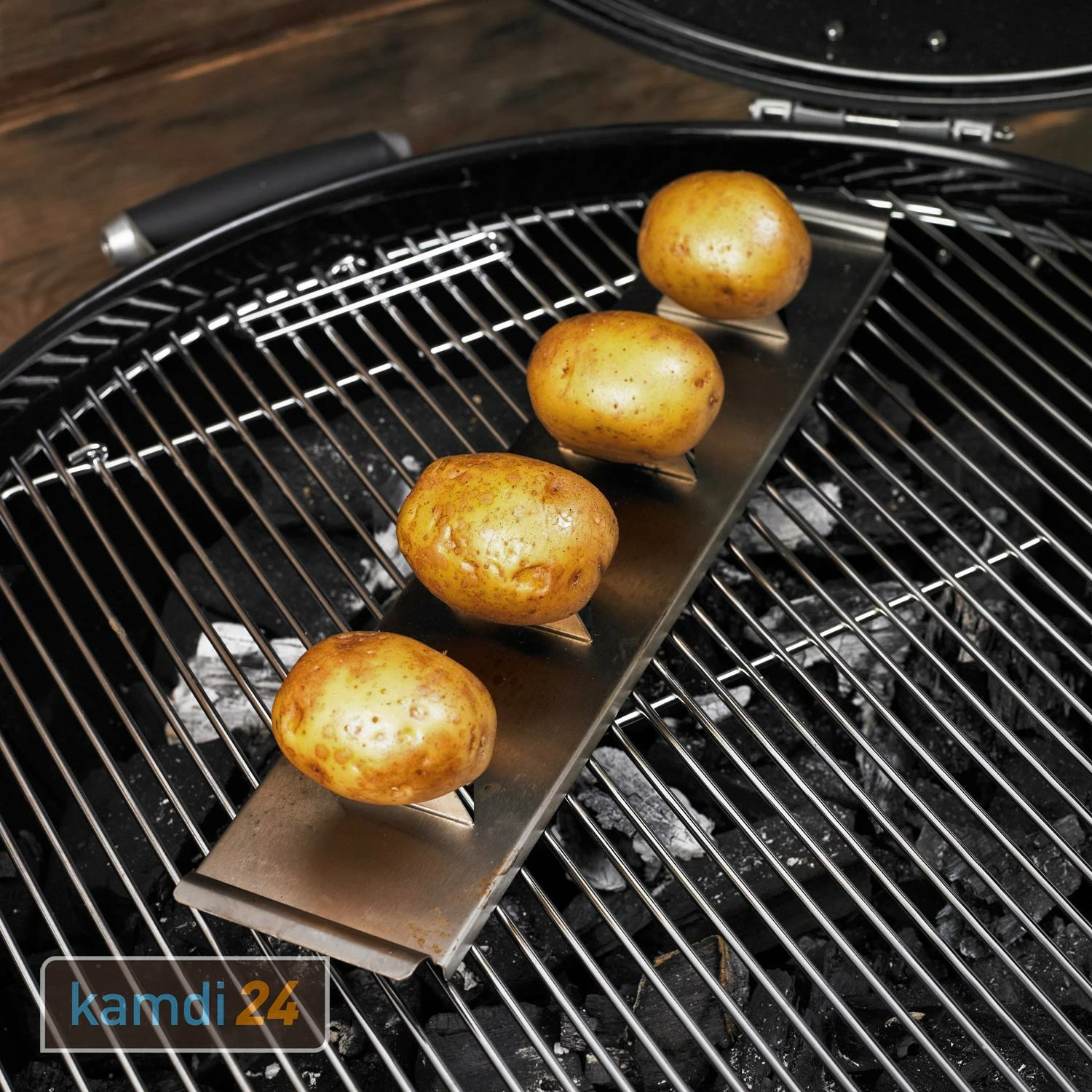 Vier auf einen Streich – mit dem können vier Kartoffeln gleichzeitig im geschlossenen Grill gegart werden. Der Halter aus Edelstahl bietet Platz für vier große Knollen und sorgt für ein gleichmäßiges Garen von innen nach außen. Die Kartoffeln werden auf dem Halter aufgespießt und dieser mit Hilfe der seitlichen Griffe auf den Grill gestellt.