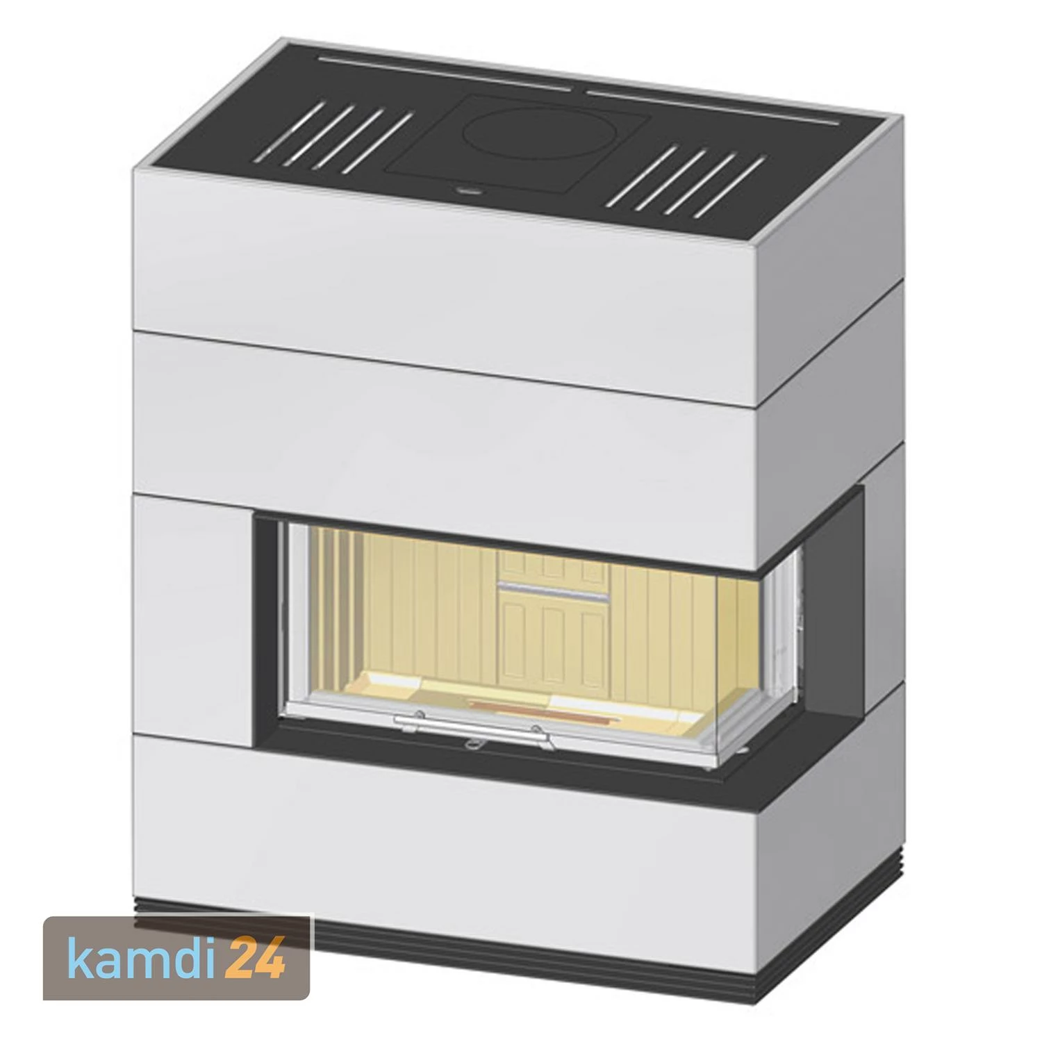 Die große Eck-Panorama Sichtscheibe gewährt einen sehr guten Blick auf das Flammenspiel im Brennraum. Durch die elegante Schiebetür lässt sich der Kamin leicht öffnen, um Holz nachzulegen oder den Kamin zu reinigen.