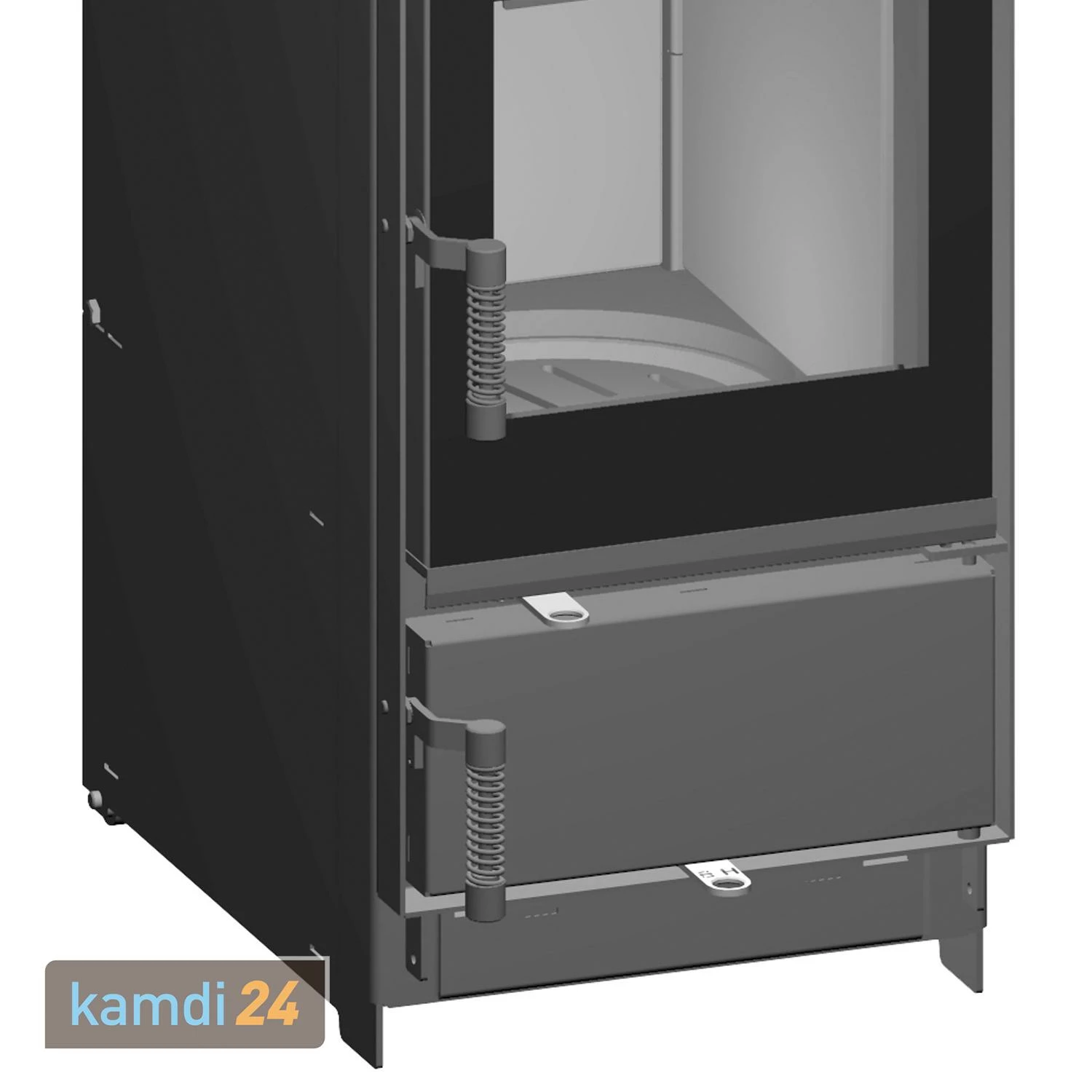 Der Kamineinsatz kann sowohl mit Scheitholz und Holzbriketts als auch mit Braunkohle betrieben werden. Die Verbrennungsluftzufuhr wird, abgestimmt auf den jeweiligen Brennstoff, über einen Schieberegler eingestellt.