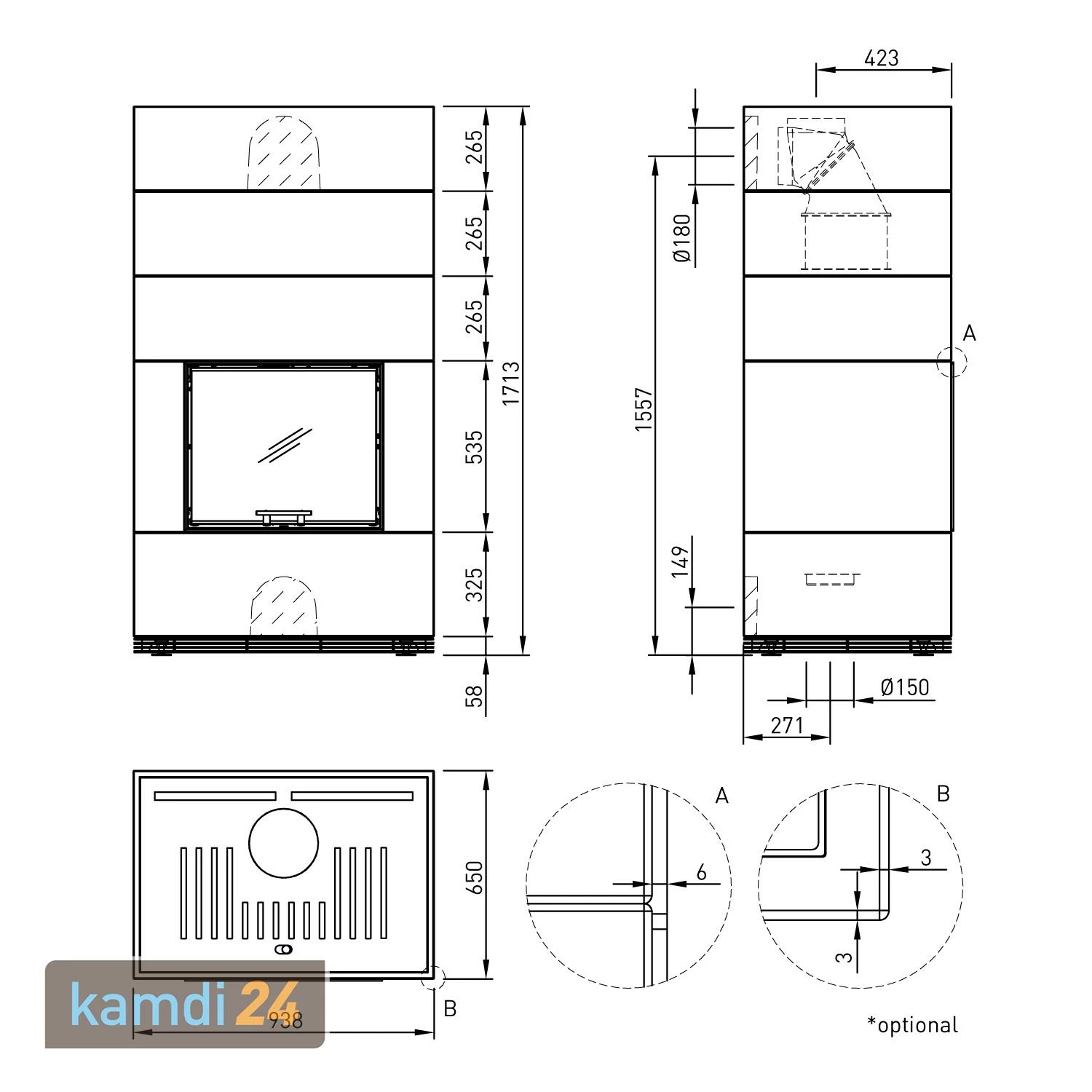 Gestalten Sie sich mit dem von Ihre individuelle Kaminanlage ganz nach Ihren Vorstellungen! Der bietet dank seiner großen Sichtscheibe einen guten Blick auf das lodernde Feuer. Der umlaufend bedruckte Rand gibt dem Flammenbild einen optisch schicken Rahmen. Zum Nachlegen von Scheitholz, lässt sich die Brennraumtür – im Gegensatz zu vielen anderen Kamineinsätzen mit Schwenktür – elegant nach oben aufschieben. Die hält die Sichtscheibe frei von Asche- und Rußablagerungen.