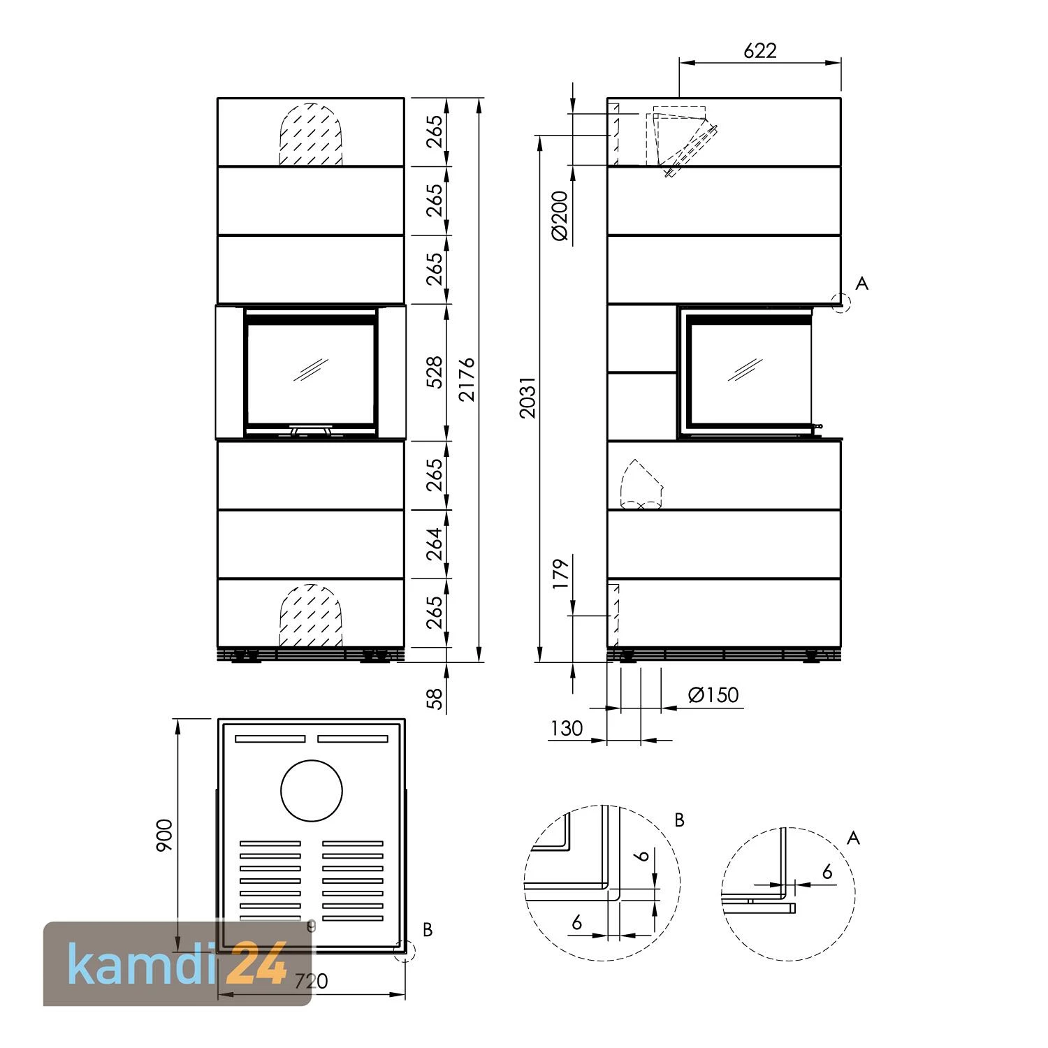 Über Konvektion erzeugt schnell eine hohe Temperatur. Diese Wärmeenergie kann von der Speichermasse aufgenommen und noch nach dem Abbrand an den Raum abgegeben werden. Je mehr Speichermasse den Kamin umschließt, desto größer ist der Wärmeerhalt.