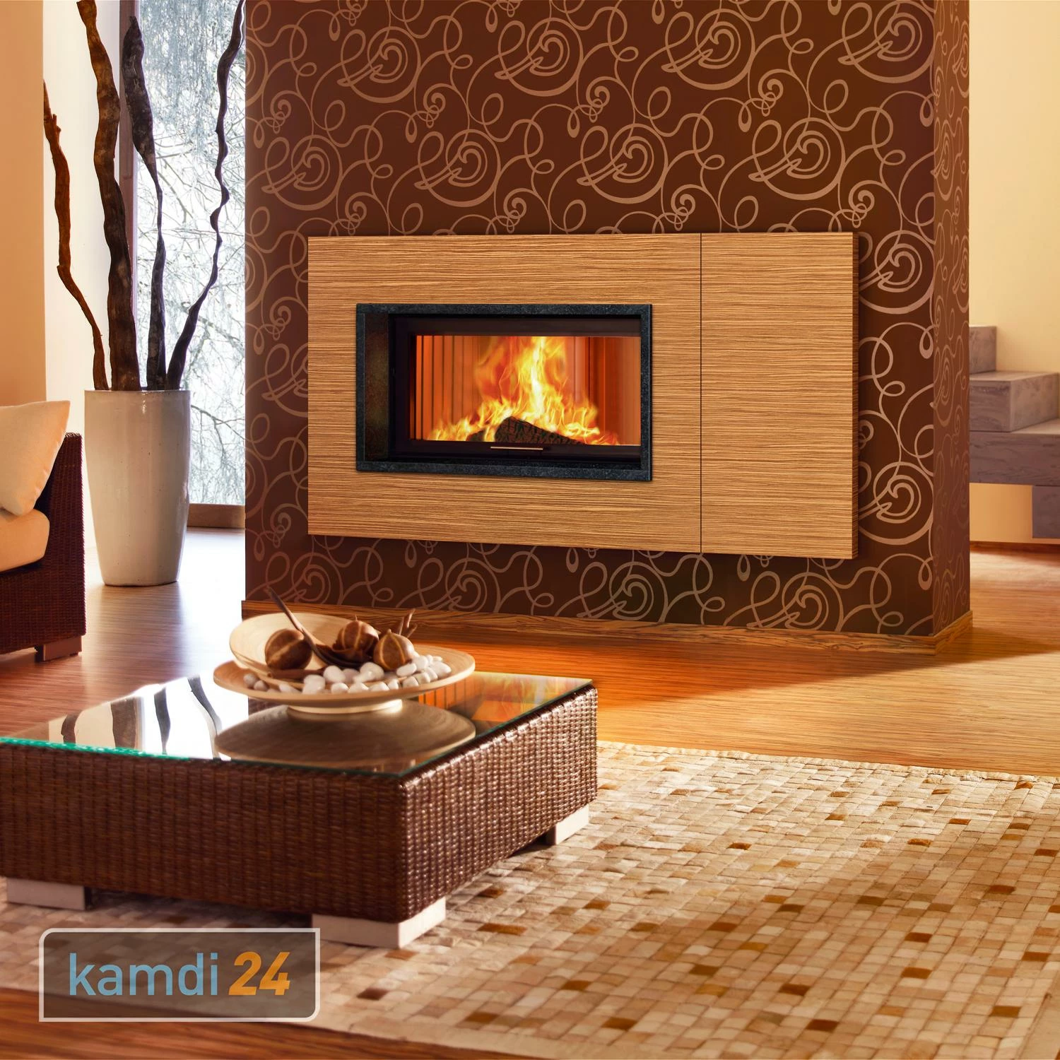 Der wasserführende Kamineinsatz von ist mit seiner 108 cm breiten Brennraumtür das Highlight eines jeden Wohnzimmers. Mit der schwarzen Umrahmung am Glas wirkt das Feuer im Kamin wie ein Gemälde und lässt jeden Raum edel wirken.