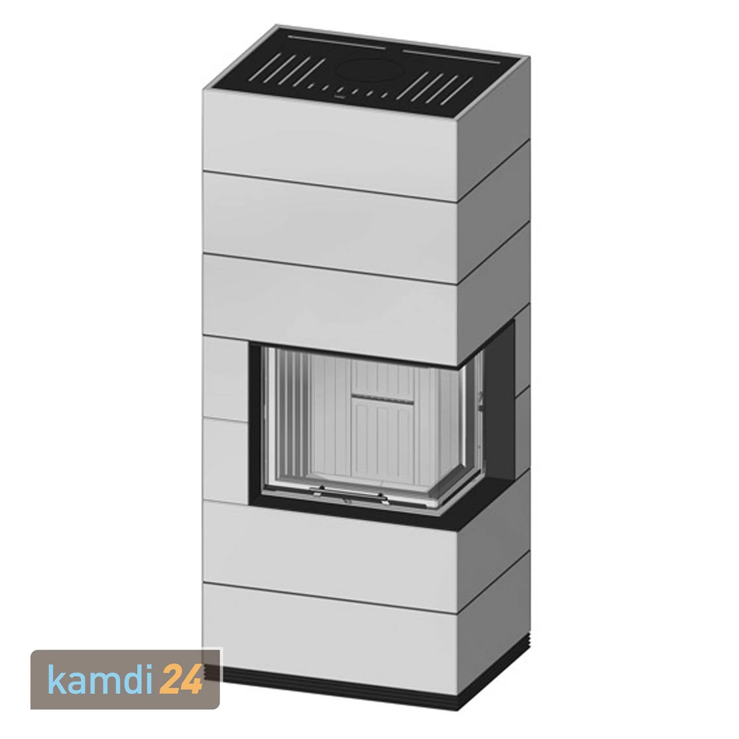 Seine robusten Verkleidungs-Modulteile haben ein hohes Wärmespeichervermögen. Die Steine geben nach dem Abbrand noch Wärme an den Aufstellraum ab. Sie können den Bausatz mit einem, zwei oder drei Unterbaumodulen bei uns kaufen. Die große Eck-Panoramascheibe gewährt einen sehr schönen Blick auf die Flammen im Brennraum.