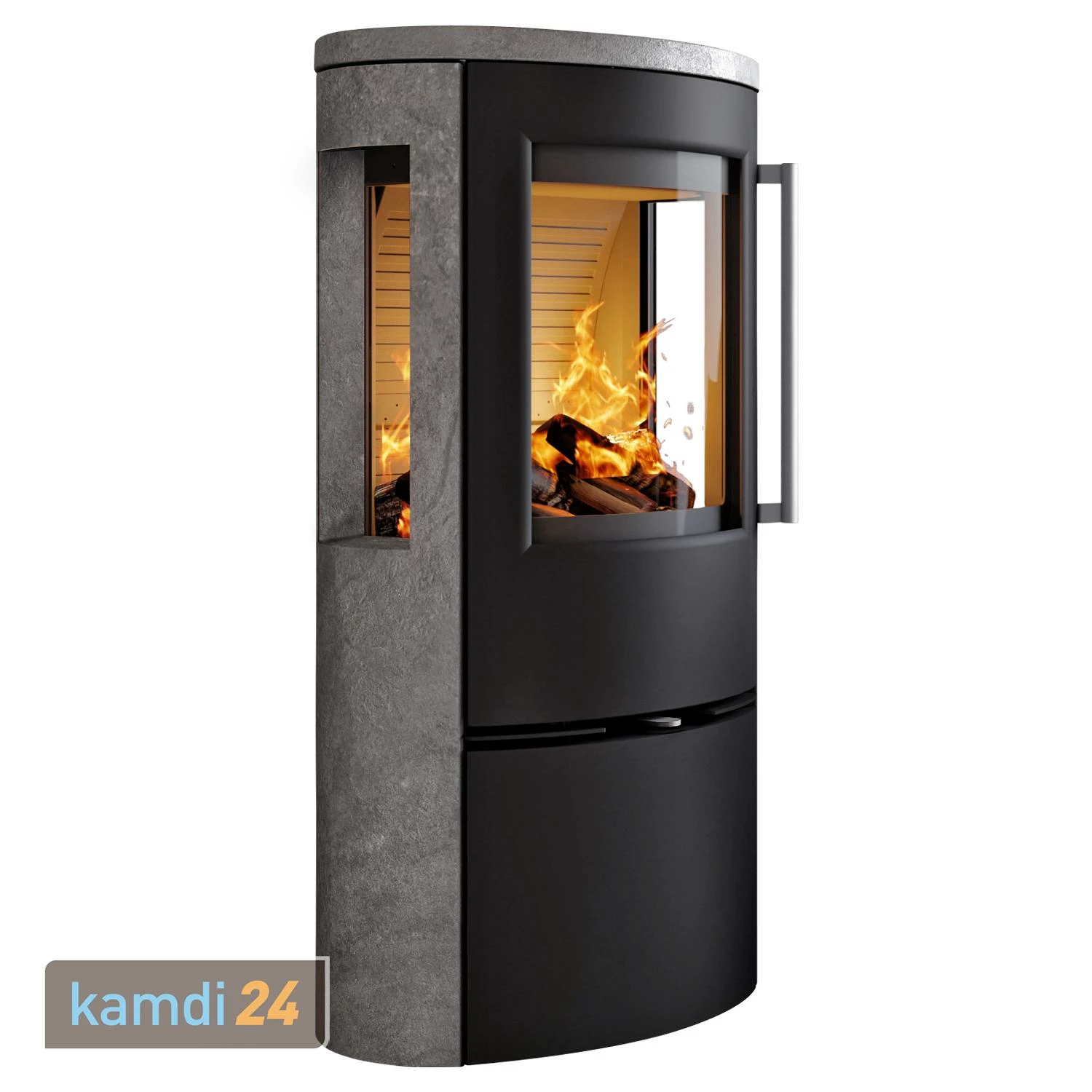 Für alle, die von Flammen und Wärme nicht genug bekommen können: Der von beeindruckt mit seiner und der massiven . Genießen Sie den Blick auf die Flammen sowohl durch die große gewölbte Sichtscheibe, als auch durch die beiden Seitenfenster – dadurch haben Sie das Feuer von nahezu jedem Punkt im Raus aus immer im Blick. Die hochwertige Verkleidung aus natürlichem Speckstein speichert die Verbrennungswärme besonders gut und gibt diese nach dem Abbrand noch lange an den Aufstellraum ab.